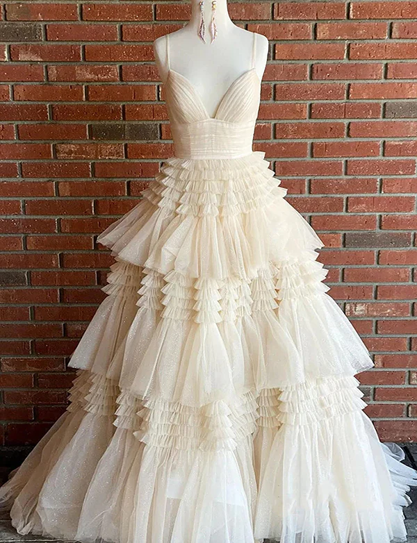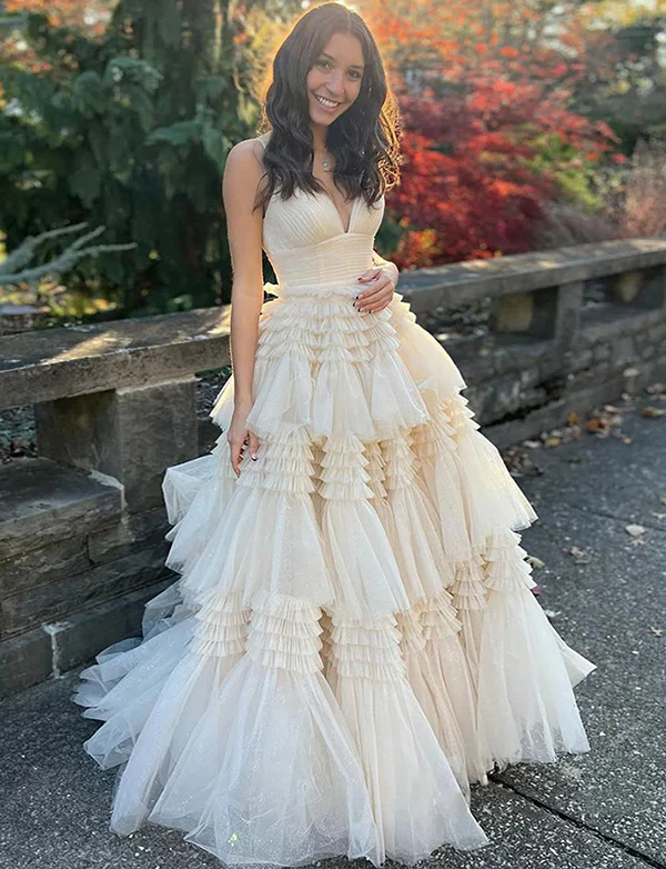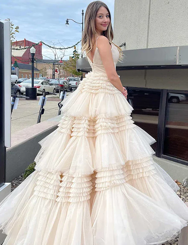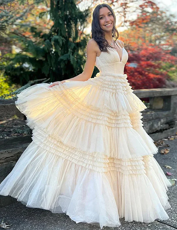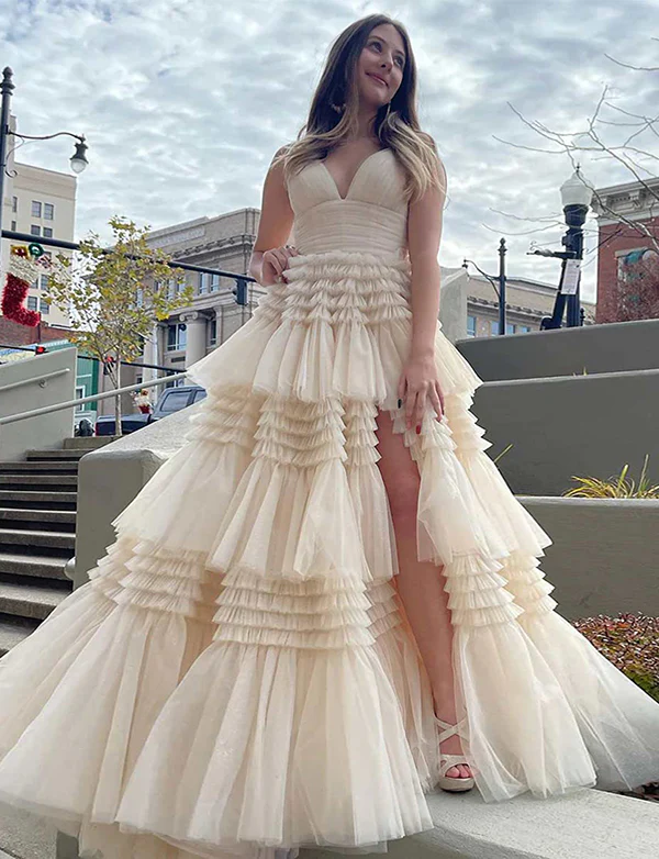 Robe de bal de fin d’année en tulle beige à bretelles spaghetti avec fente