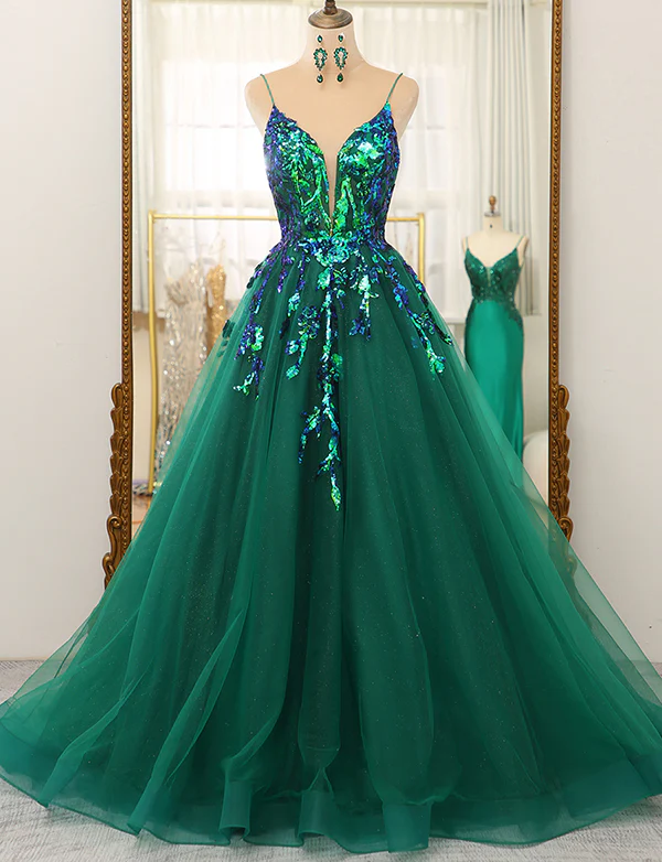 Robe de bal de fin d’année en vert foncé à col en V profond avec applications