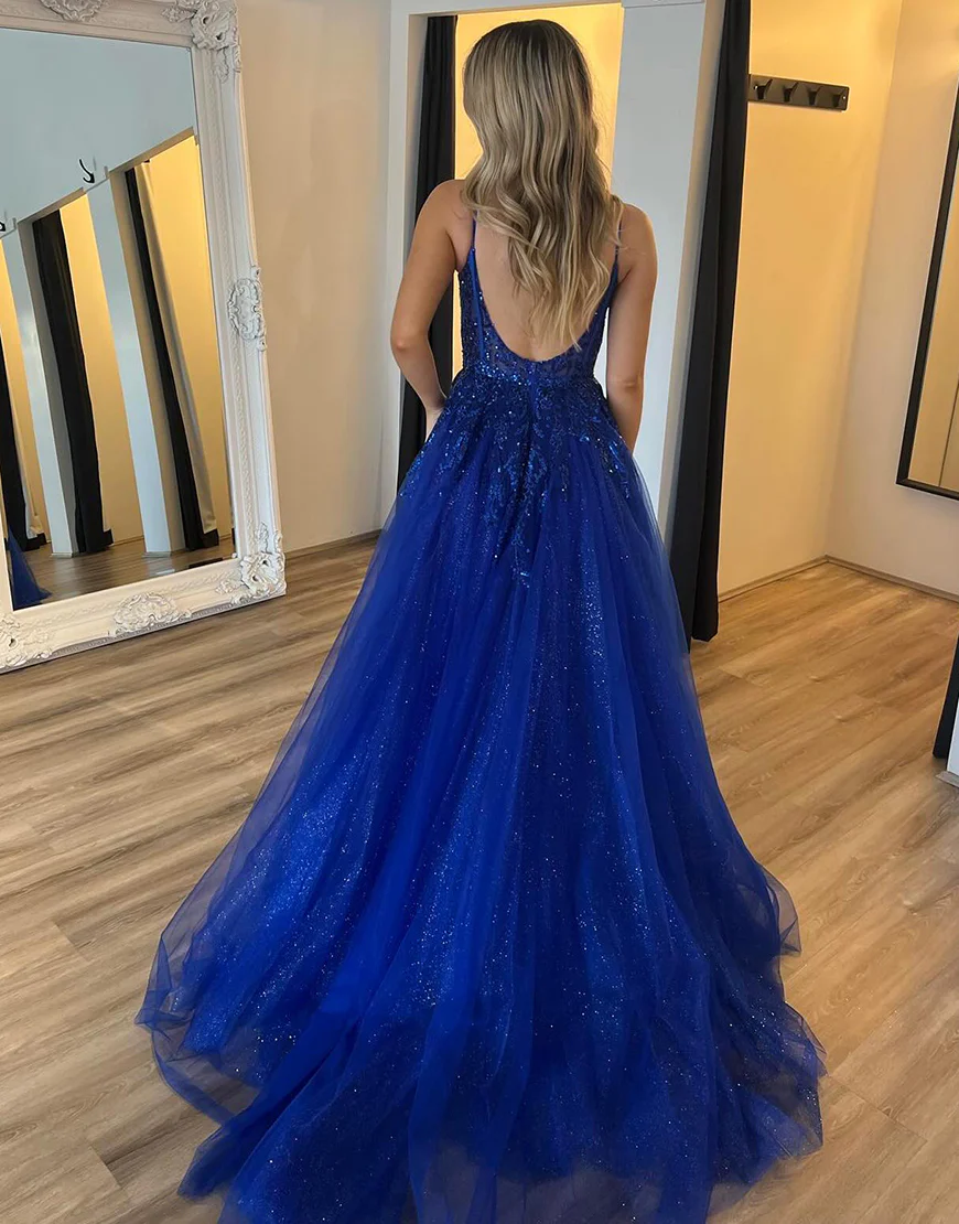 Sublimez votre look dans cette robe de bal en forme de A bleu royal avec applique de spaghettis et fente. Conçue en tulle avec une superbe applique de dentelle, cette robe sans manches met en valeur votre silhouette en forme de ligne A. Avec son décolleté arrière et sa fente, cette robe offre une touche de sensualité. Parfaite pour toute occasion spéciale.