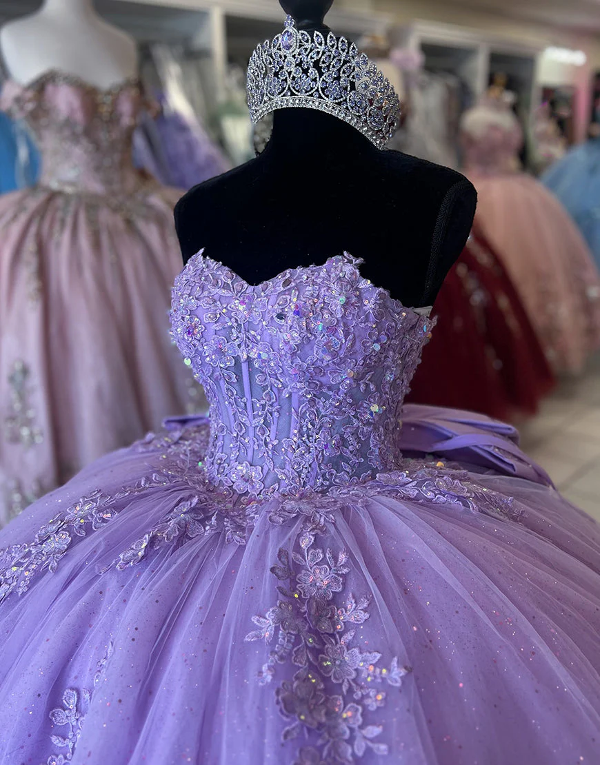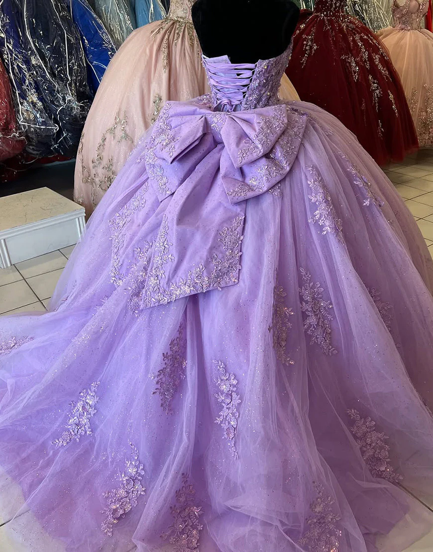 Robe de bal en tulle à appliqués lilas scintillants avec décolleté en cœur et nœud