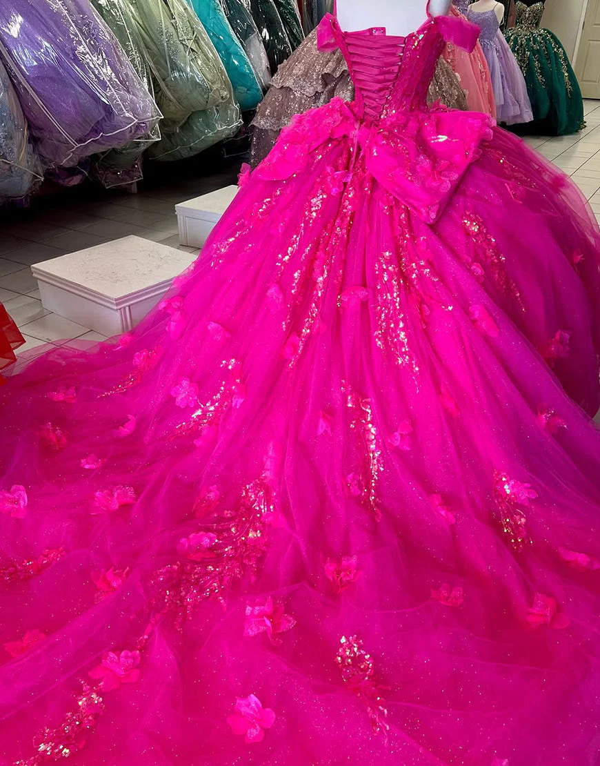 Design: Cette robe de bal en tulle fuchsia est parfaite pour les occasions spéciales. Les fines bretelles et le laçage mettent en valeur votre silhouette, tandis que le tulle ajoute une touche élégante. Les appliques délicates et le nœud apportent une touche de charme à cette robe sans manches.