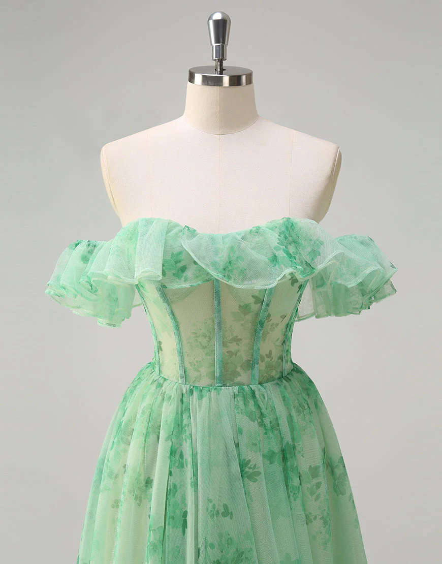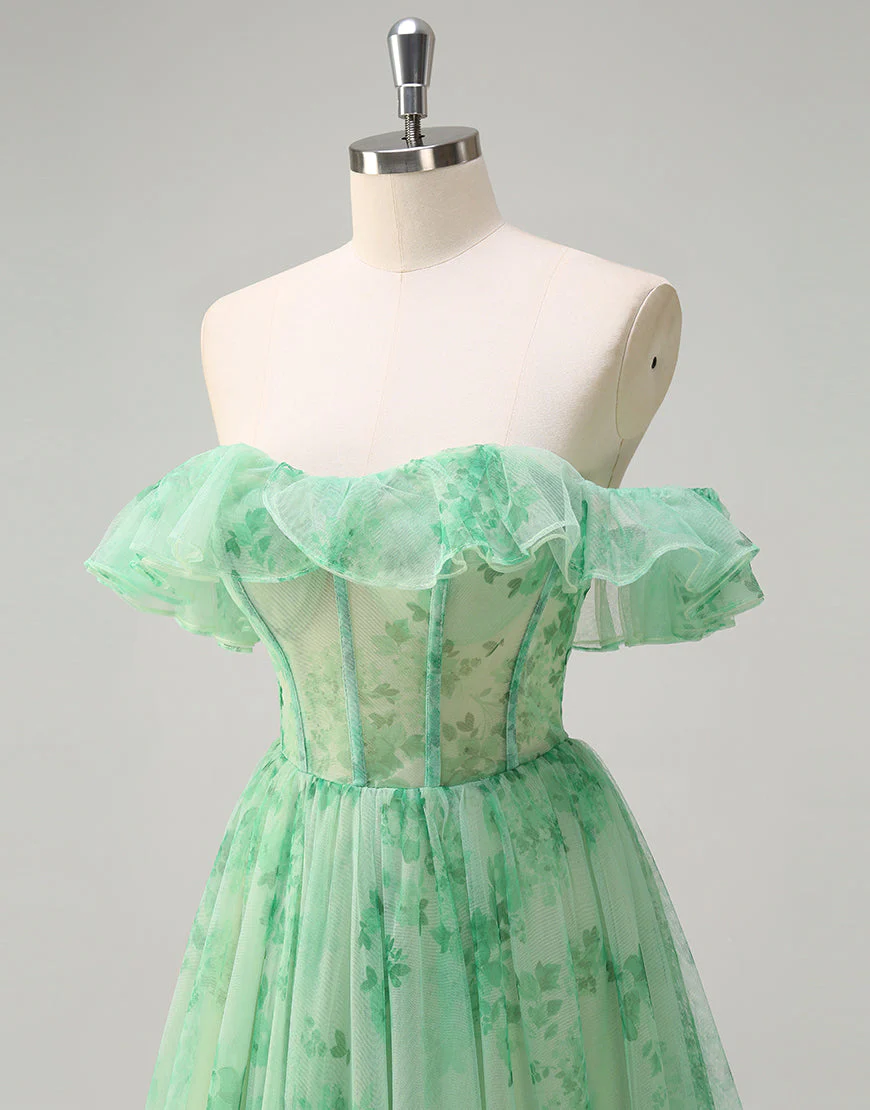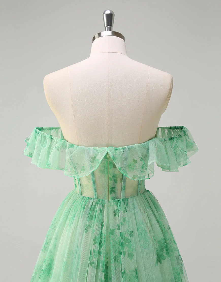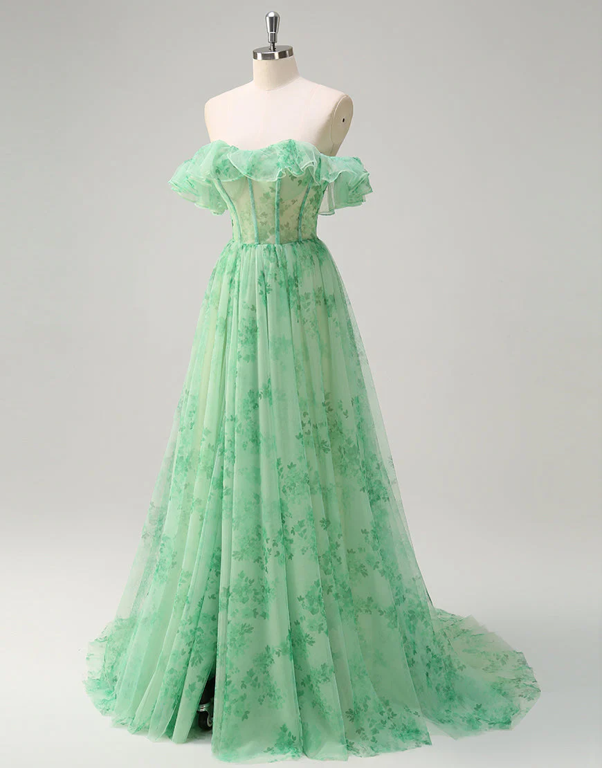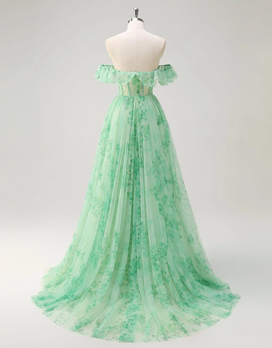 Design: Découvrez notre magnifique robe de bal verte en tulle imprimé, sans bretelles, dos nu, avec une élégante traîne à balayage et une fente. La coupe trapèze mettra en valeur votre silhouette tandis que la fermeture éclair assure un ajustement parfait. Parfait pour votre prochain bal de promotion.