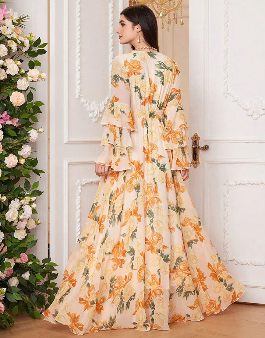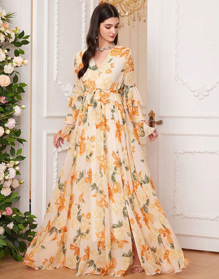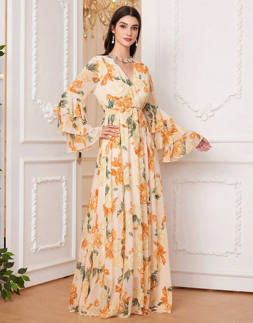 Design: En tant qu’expert de la mode, nous vous présentons notre robe de bal jaune à volants, avec une coupe trapèze flatteuse, un élégant col en V et des manches longues pour une touche de sophistication. Longue au sol et imprimée d’un motif floral, cette robe est parfaite pour les occasions spéciales. Complétée par une ceinture pour souligner votre taille, elle vous permettra de rayonner avec élégance.