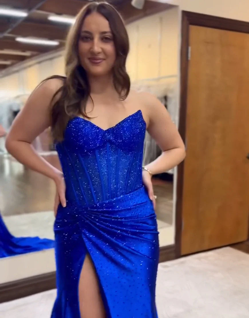 Design: Cette robe de bal en satin bleu royal sans manches présente un décolleté en coeur classique et un élégant dos nu. Le haut corset épouse parfaitement le corps et le tissu sirène met en valeur votre silhouette. La traîne et les perles apportent une touche de glamour à cette robe longue pour une soirée mémorable.