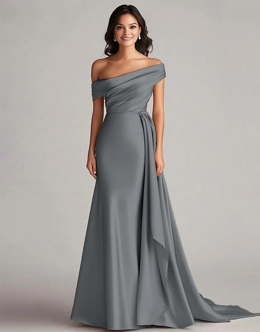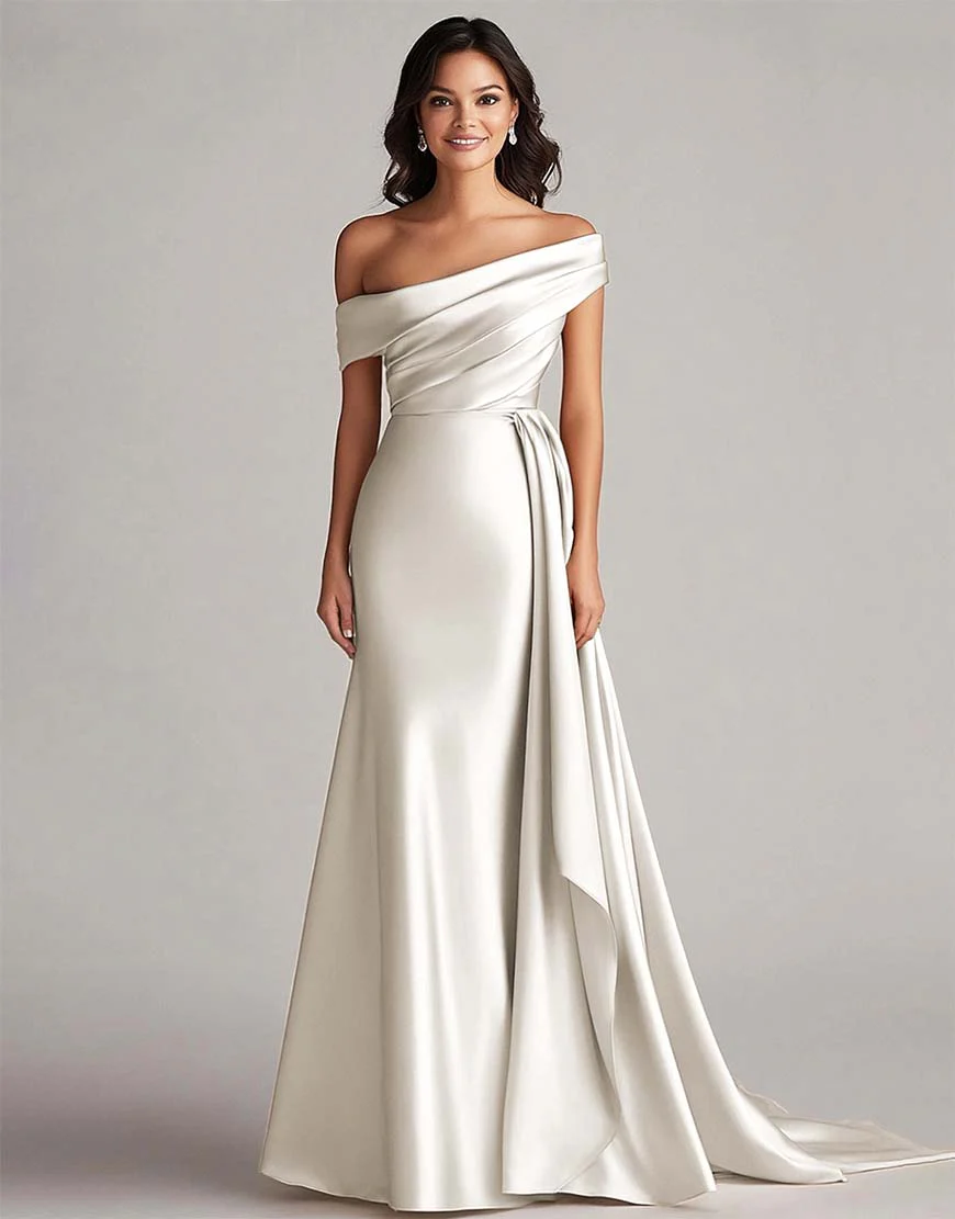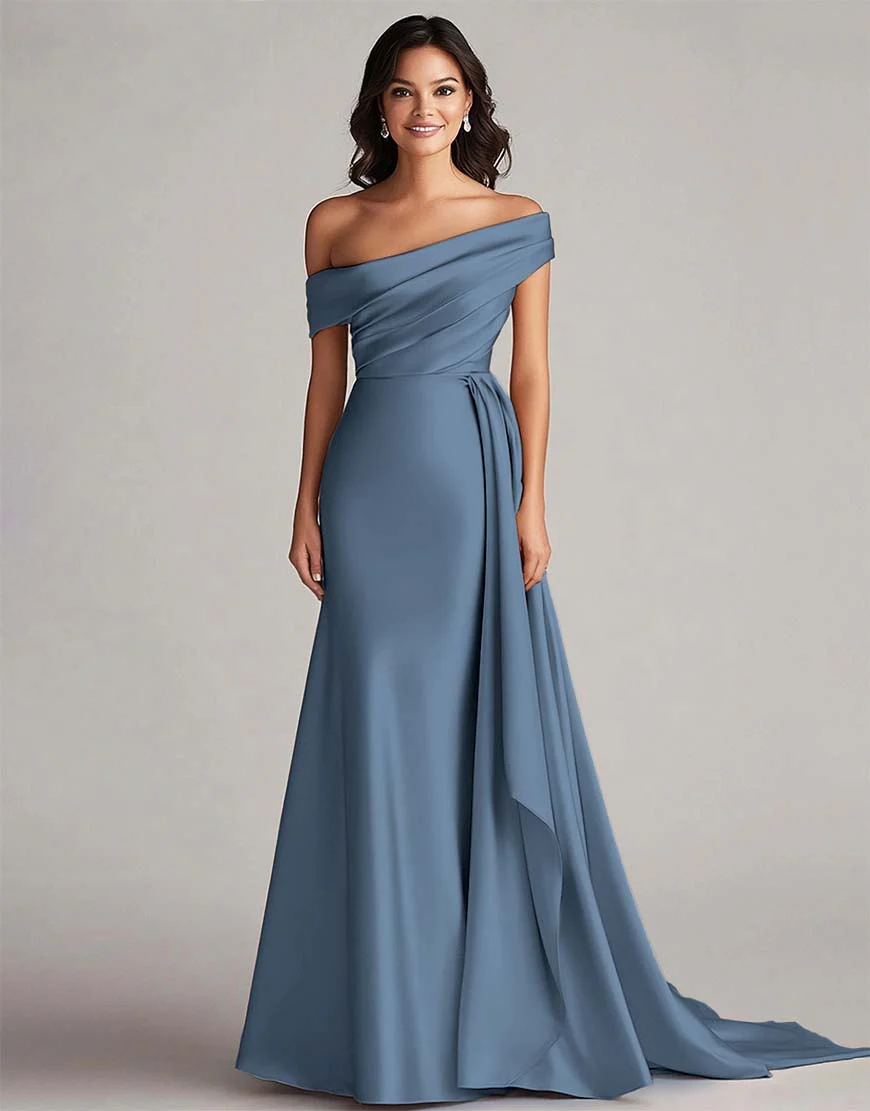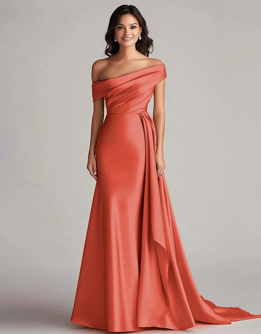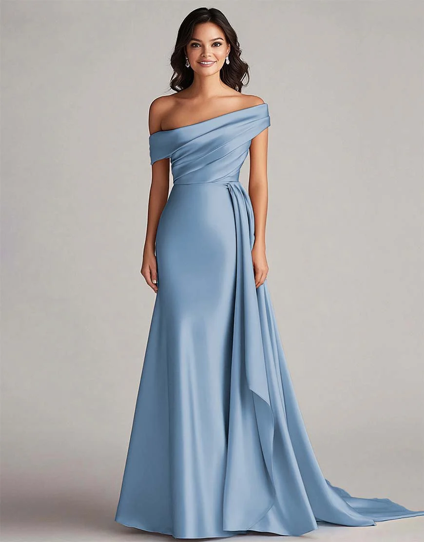 Design: Cette robe de bal en satin moulant est à la fois élégante et flatteuse avec sa coupe sirène et son encolure asymétrique. Idéale pour les soirées et fêtes spéciales, elle allie confort et style grâce à son tissu plissé et sa traine chapelle. Une pièce indispensable pour un look sophistiqué.