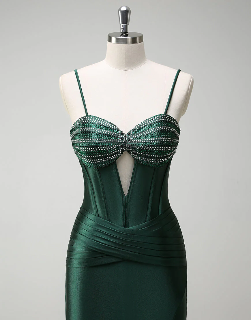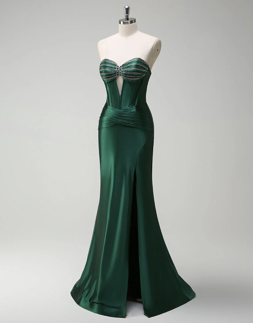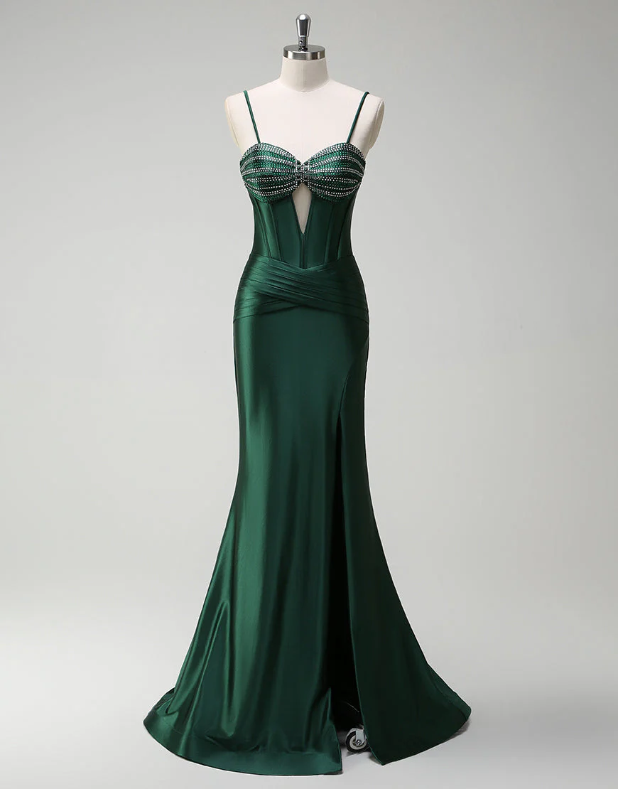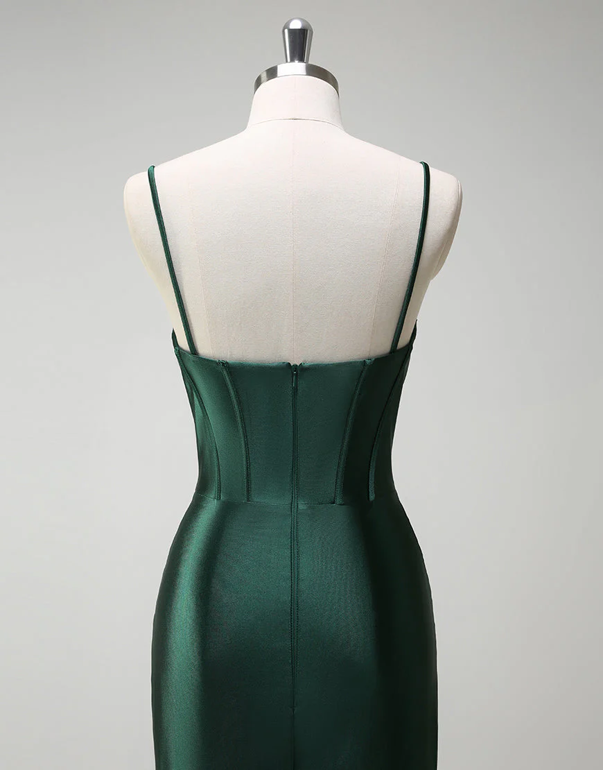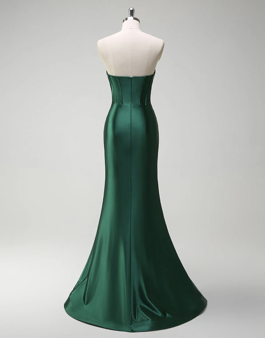 Design: La robe de bal longue en satin vert foncé est une pièce élégante et sophistiquée qui mettra en valeur votre silhouette. Avec son décolleté en cœur et sa fente, cette robe sirène sans manches et dos nu apportera une touche de sensualité à votre tenue. Sa fermeture éclair permet un ajustement parfait et sa traine longue ajoutera une allure majestueuse à votre look.
