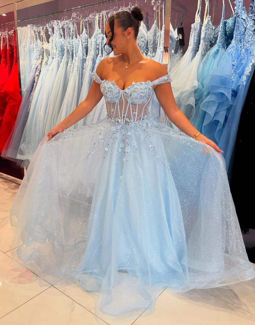 Design: Cette robe de bal trapèze en tulle bleu ciel à épaules dénudées est idéale pour une soirée élégante. Avec son dos nu et son corset long, elle mettra en valeur votre silhouette. Les appliques ajoutent une touche de sophistication à cette tenue. Faites-vous remarquer avec cette robe de bal longue.