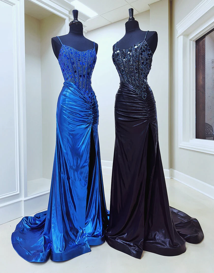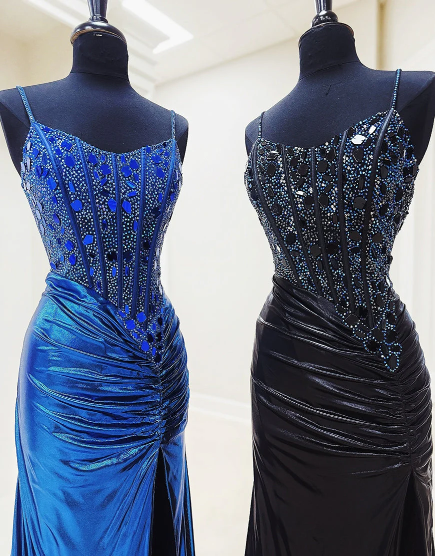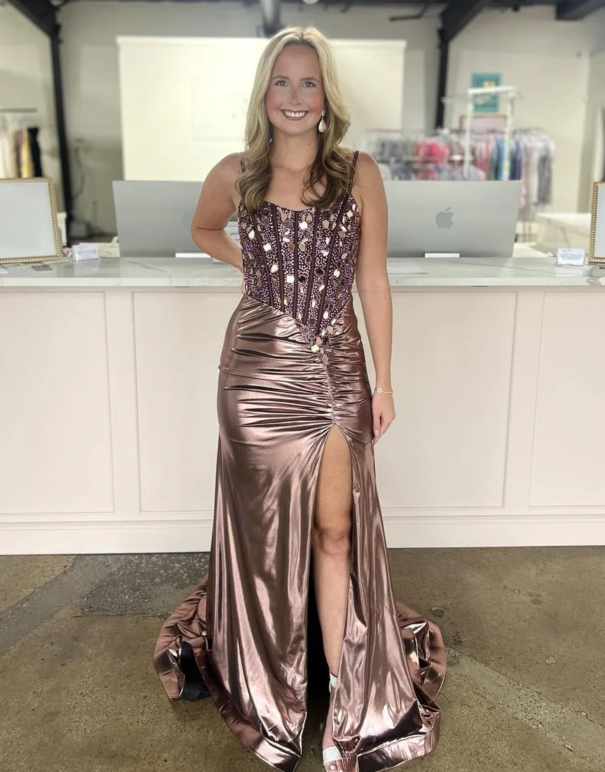 Design: Cette robe de bal longue à bretelles spaghetti est parfaite pour les soirées spéciales. Fabriquée avec des paillettes métallisées cuivrées scintillantes, elle attire tous les regards. Son design sirène sans manches et dos nu rehaussé de perles ajoute une touche de glamour. Soyez la star de la soirée avec cette robe élégante et chic.