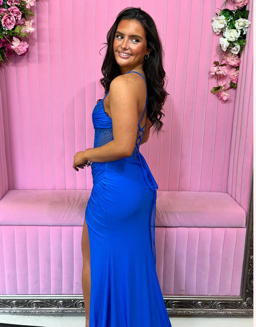 Design: Découvrez notre magnifique robe de bal sirène en satin bleu à bretelles spaghetti. Cette robe sans manches et dos-nu est éblouissante avec son corset à lacets et perles. Elle allongera votre silhouette et mettra en valeur vos courbes. Soyez prête pour votre bal avec cette robe longue et élégante.