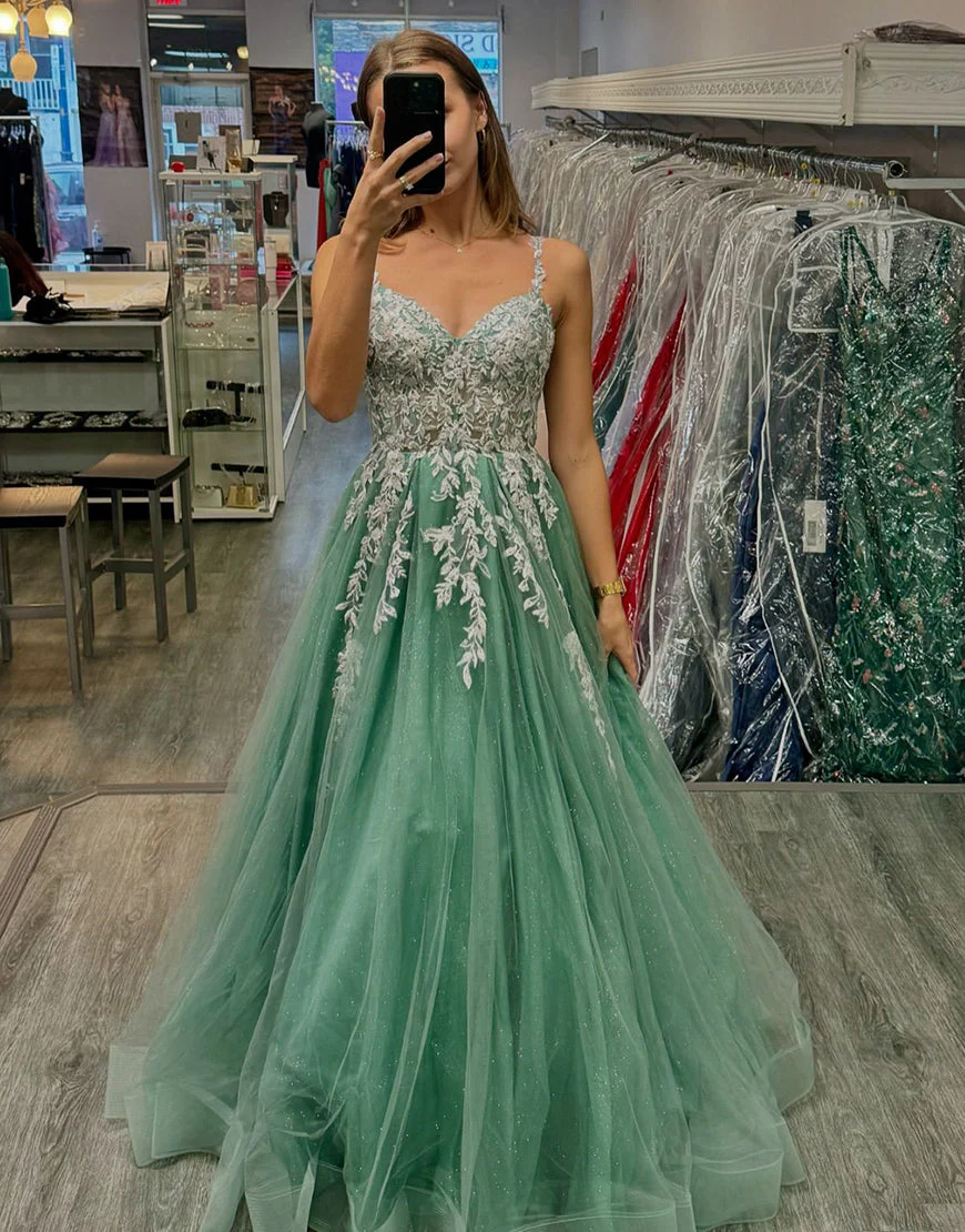 Design: Découvrez notre superbe robe de bal trapèze en tulle avec des bretelles spaghetti élégantes et un décolleté dos nu. Sa couleur tendance vert sauge est mise en valeur par de délicates appliques. Cette robe sans manches et longue est idéale pour une soirée de bal ou un événement formel. Ajoutez une touche de style à votre garde-robe avec cette robe incroyablement chic.