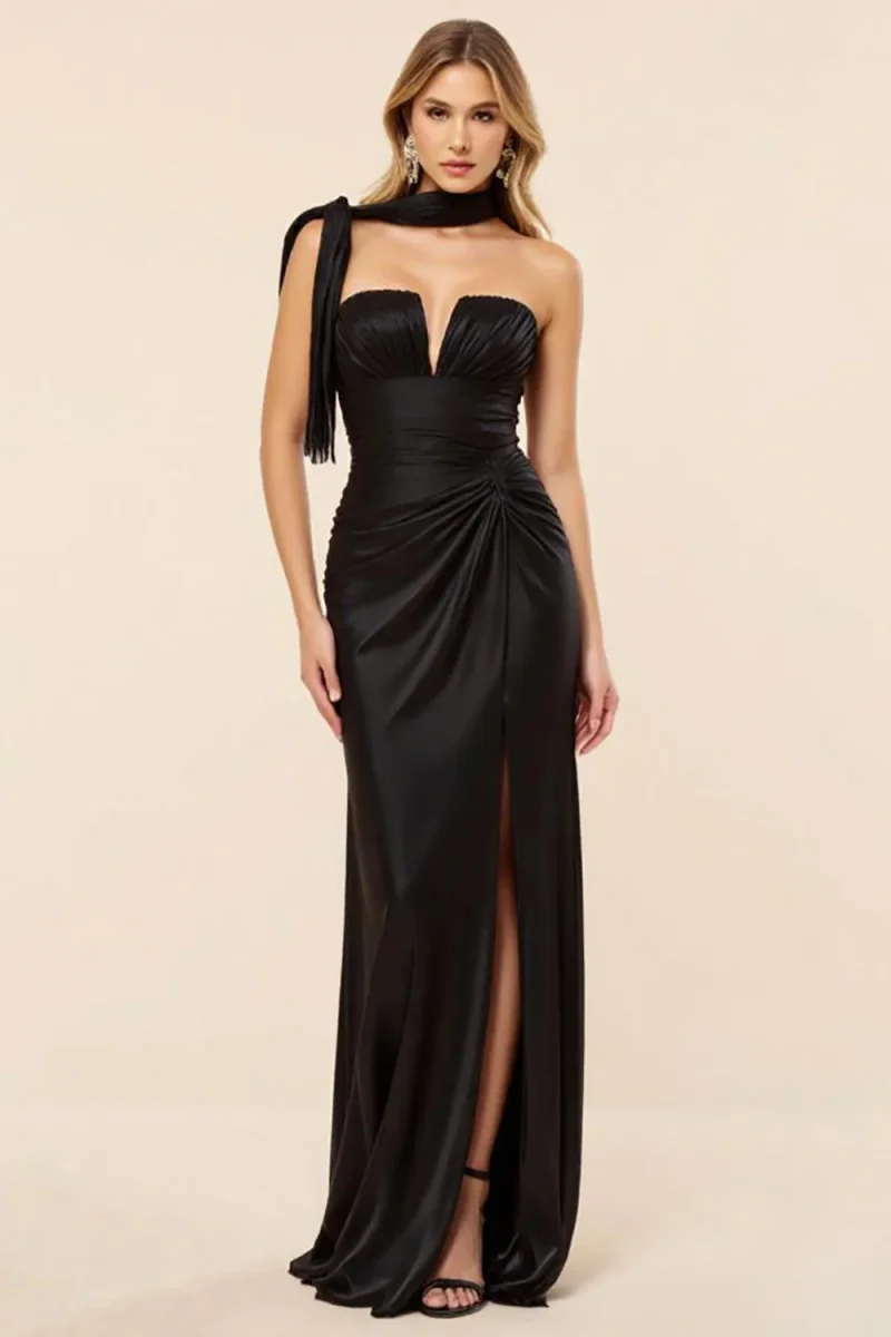 Robe de bal noire en satin froncé sans bretelles avec fente
