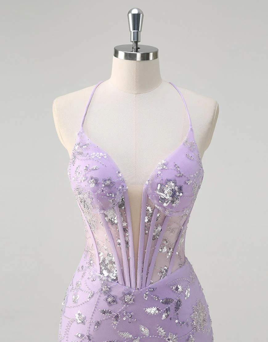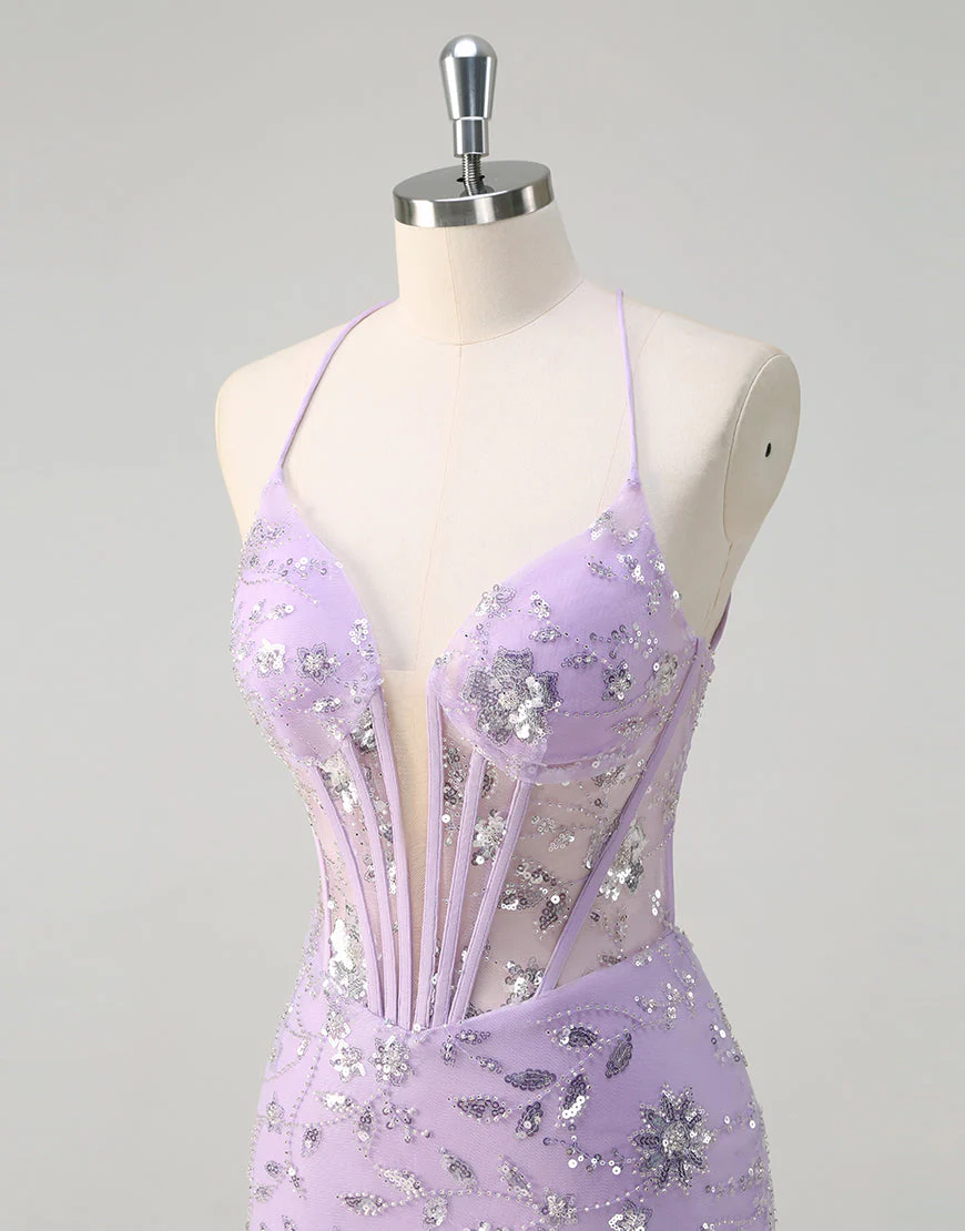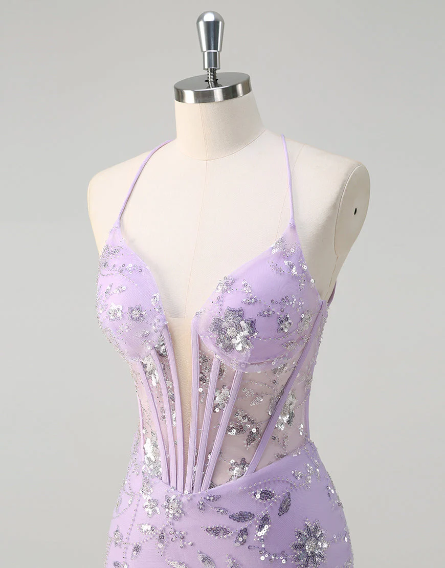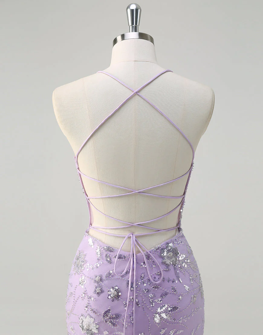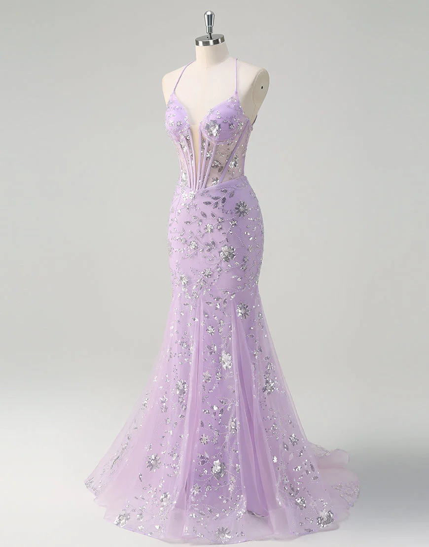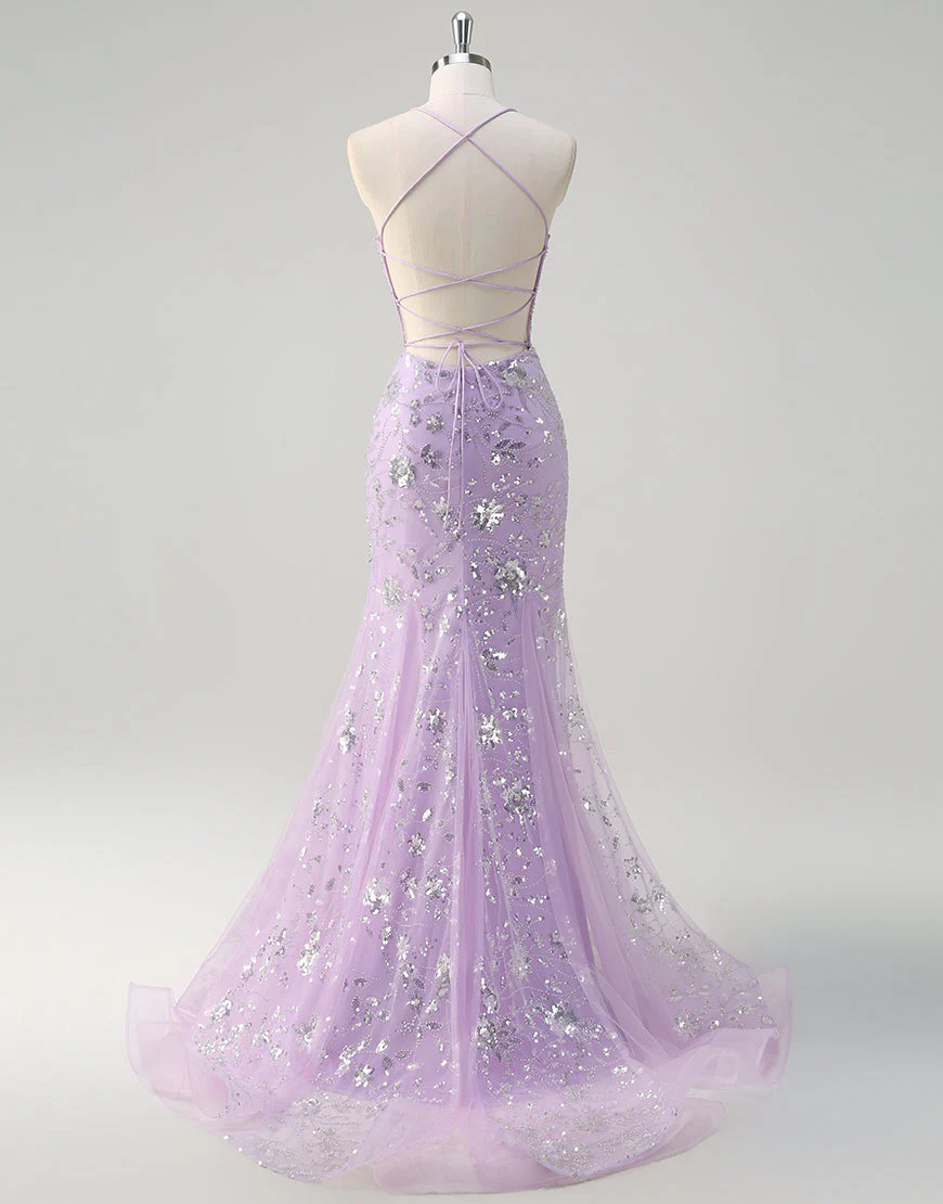Design: Découvrez la robe de bal sirène en tulle à fleurs et cristaux. Cette robe lilas sans manches et dos nu est ornée de paillettes et de fleurs en cristal pour un look éblouissant. Le tulle ajoute une touche de légèreté tandis que la traîne apporte une touche de sophistication. Parfait pour briller sur la piste de danse.