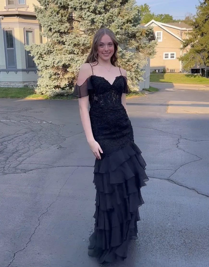 Design: Donnez-vous un look élégant et sophistiqué avec cette robe de bal noire en sirène. Les appliques délicates et le détail des bretelles spaghetti ajoutent une touche de glamour, tandis que la fente audacieuse et les volants en cascade créent un style moderne. Parfait pour les occasions spéciales, cette robe est un véritable coup de cœur pour les fashionistas.