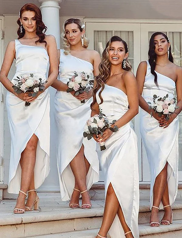 Robe de demoiselle d’honneur en satin champagne à épaules hautes et basses