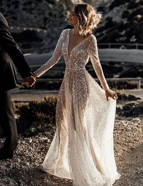 Blanc Sirène Manches Longues Balayage Train Robe de mariée avec dentelle