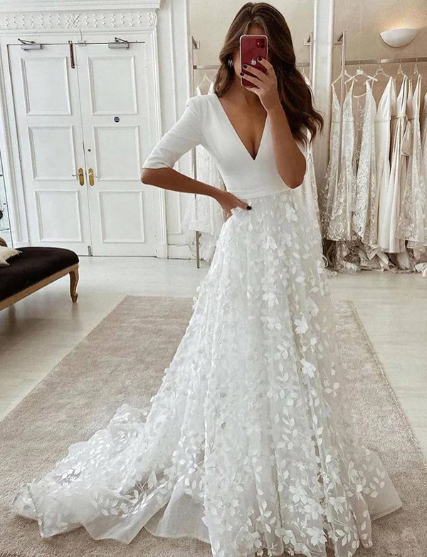 Robe de mariée blanche demi-manches à col en V avec applications