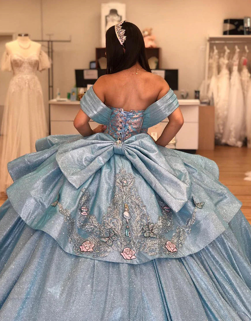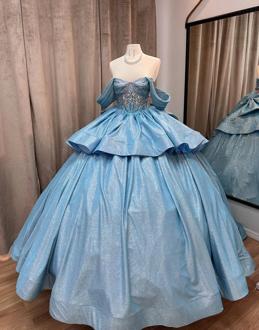 Design: Sublimez-vous lors de votre Quinceanera dans cette magnifique robe de princesse à paillettes grises et bleues. Les épaules dénudées et le dos nu ajouteront une touche de sensualité, tandis que les lacets garantissent un ajustement parfait et confortable. La traîne complète le look royal de cette robe.