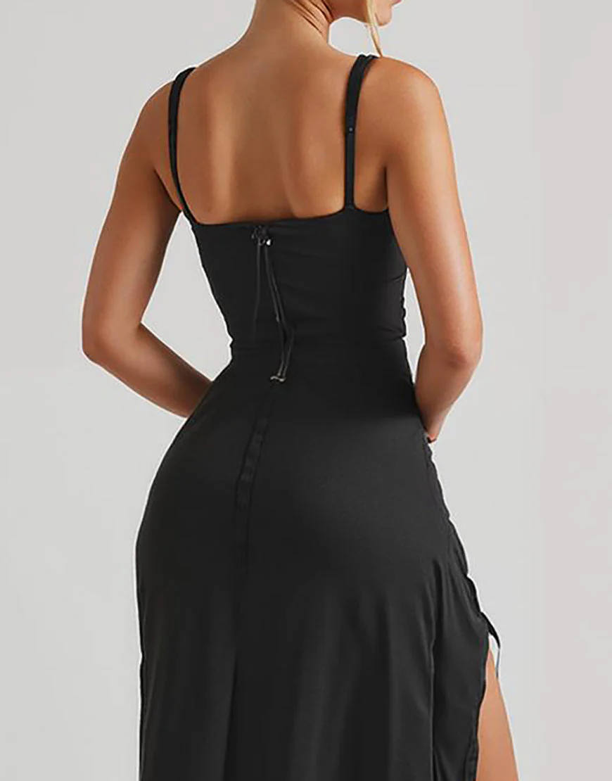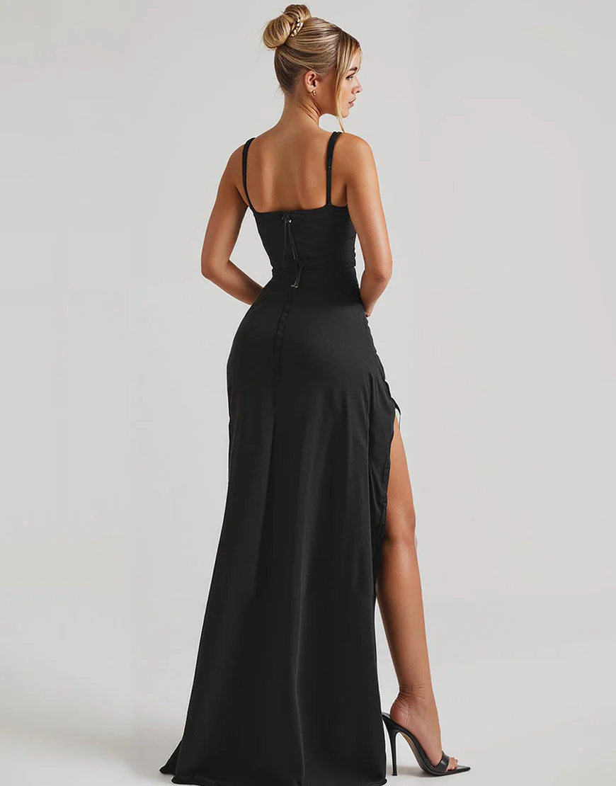 Robe de soirée à bretelles spaghetti fourreau noir avec fente