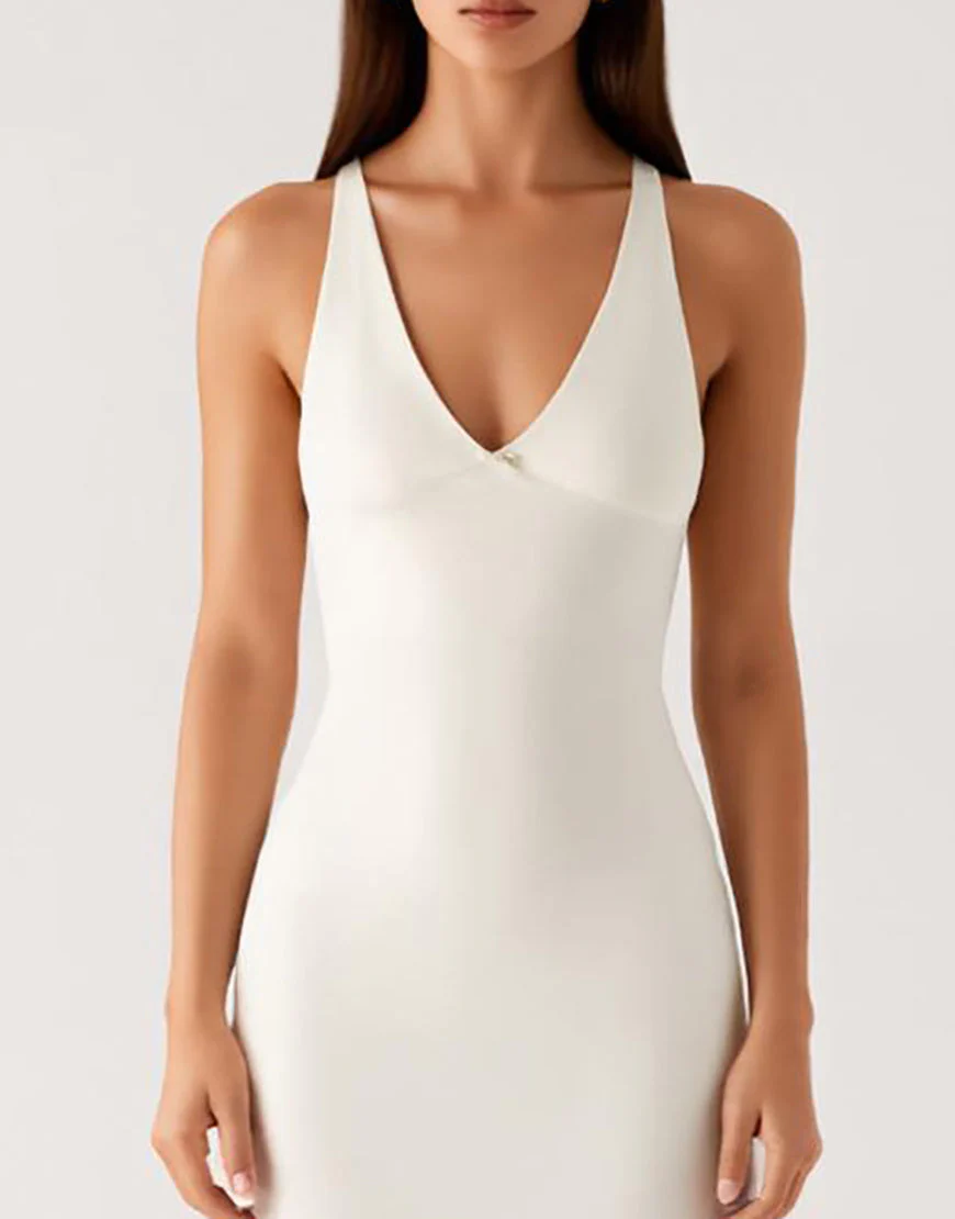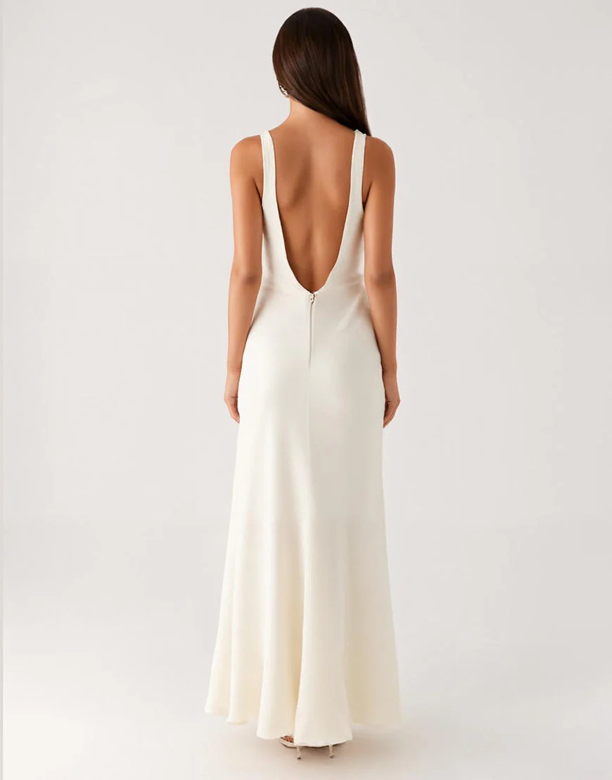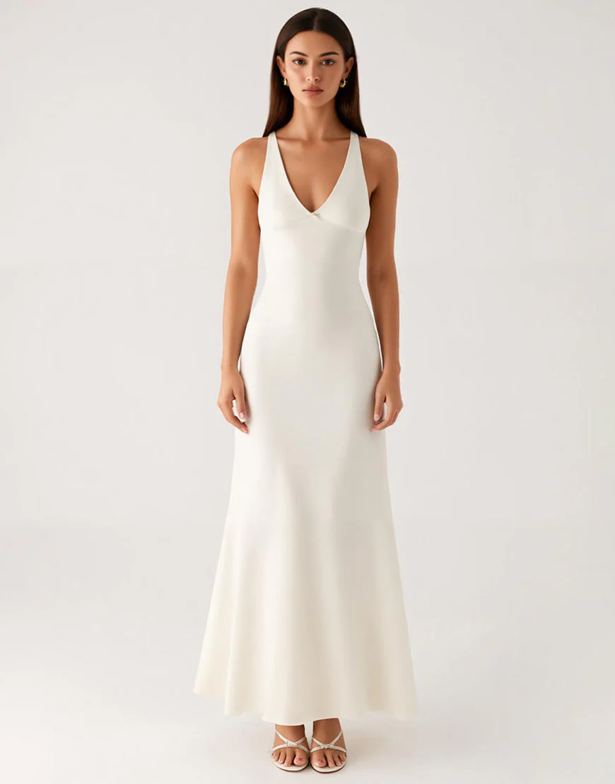 Robe de soirée à col en V ivoire fourreau jusqu’à la cheville