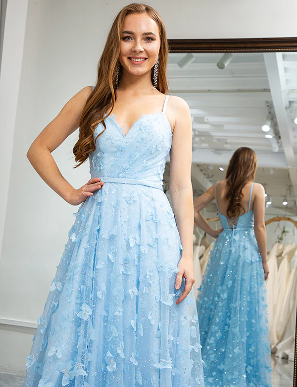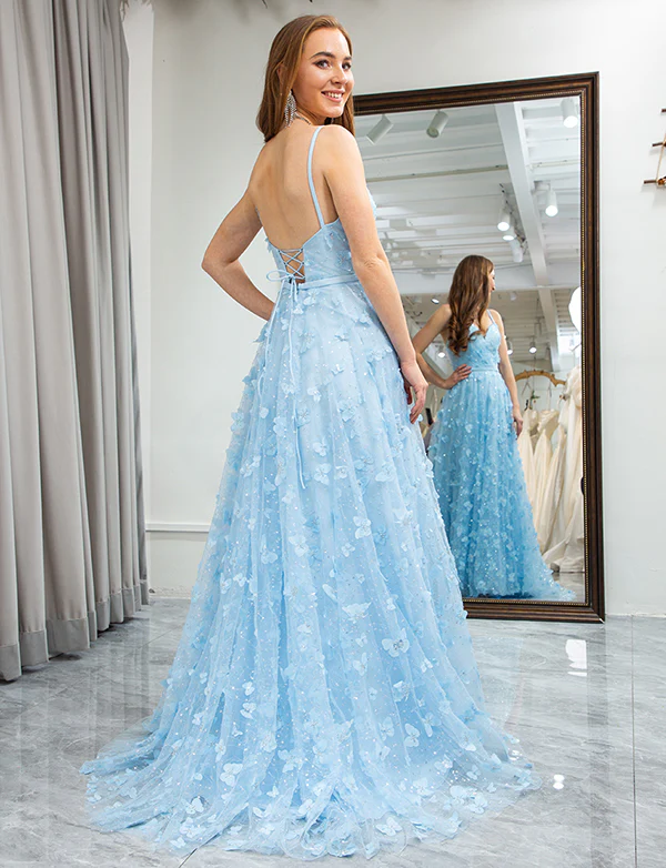 Soyez le premier à laisser votre avis sur “Robe de soirée bleu ciel à bretelles spaghetti et perles avec fente”