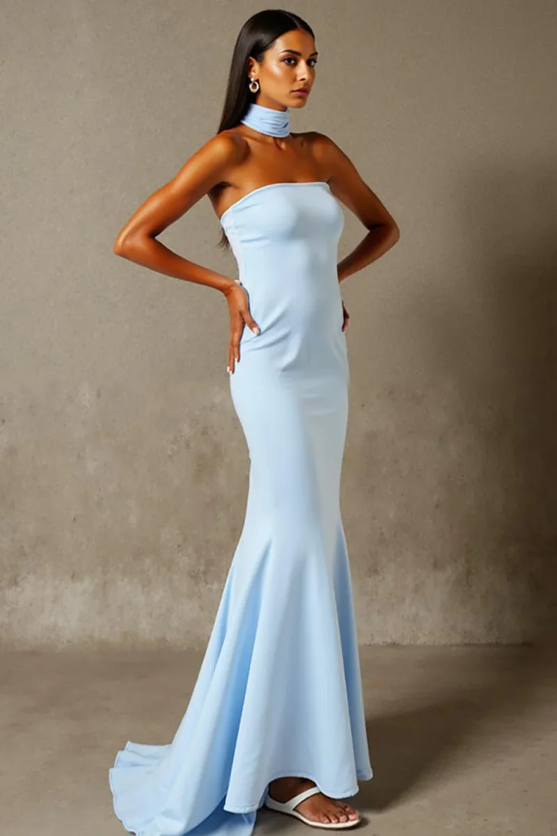 Robe de soirée bustier sirène bleu ciel avec ceinture