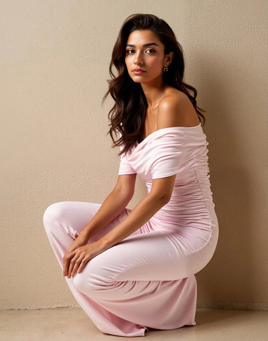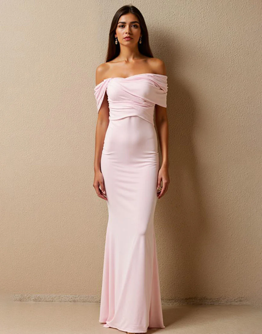 Robe de soirée en mousseline de soie sirène rose clair à épaules dénudées
