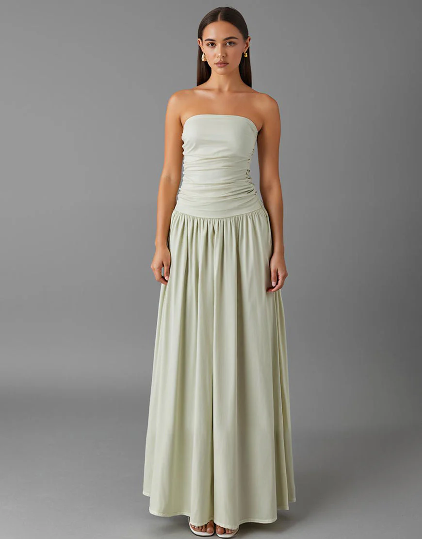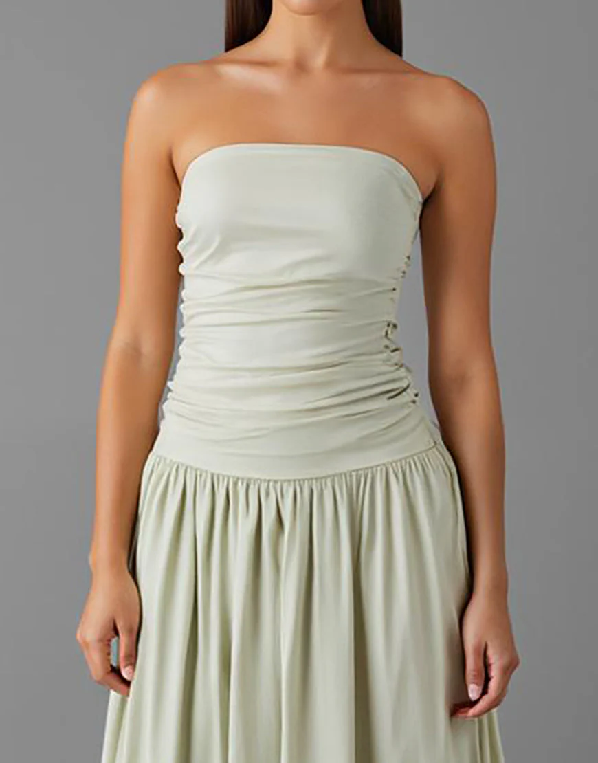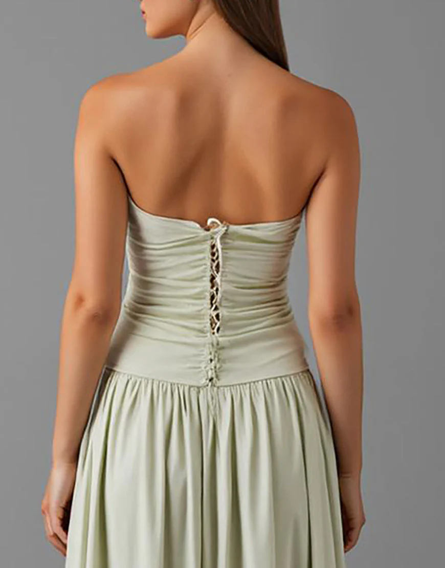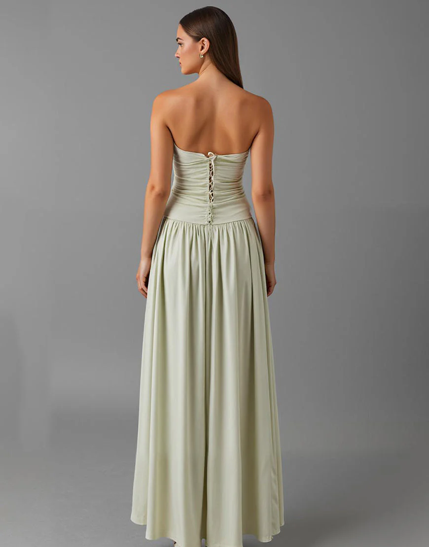 Robe de soirée froncée sans bretelles en mousseline de soie gris clair