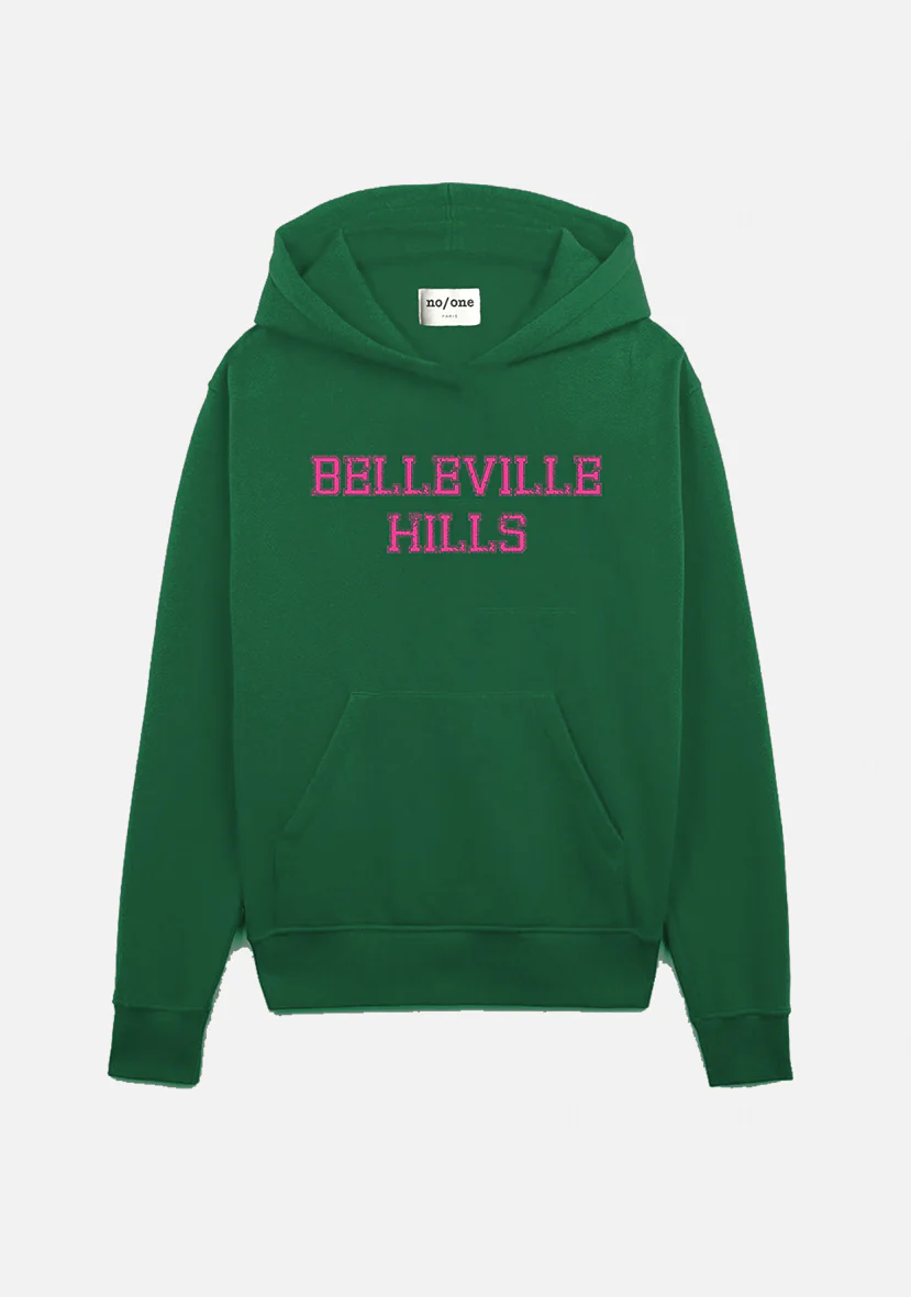 Sweat à capuche unisexe en coton bio et polyester recyclé avec logo « BELLEVILLE HILLS » typo en blanc. Fait pour durer, ce t-shirt est doux et éthique, et sa coupe vous permettra de le porter avec style tout en vous sentant à l’aise..