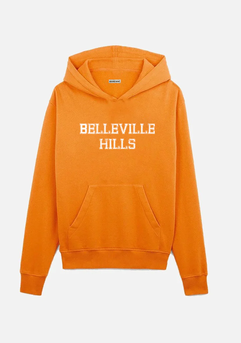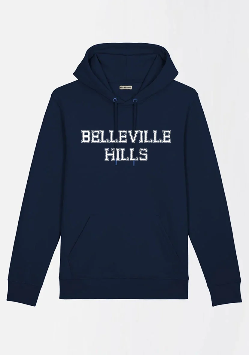 Sweat navy à capuche en coton bio et polyester recyclé avec logo « BELLEVILLE HILLS » typo en blanc. Fait pour durer, ce t-shirt est doux et éthique, et sa coupe vous permettra de le porter avec style tout en vous sentant à l’aise.