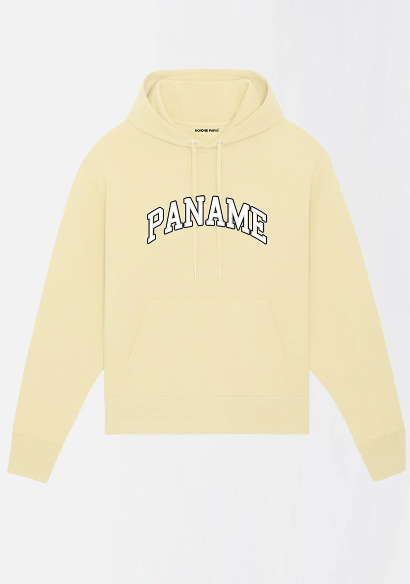 Sweat à capuche à manches longues jaune en coton bio avec logo « PANAME » style collège blanc à contour noir. Cette pièce intemporelle est fabriquée à partir de matières durables et respectueuses de l’environnement, ce qui en fait un élément idéal de votre garde-robe…