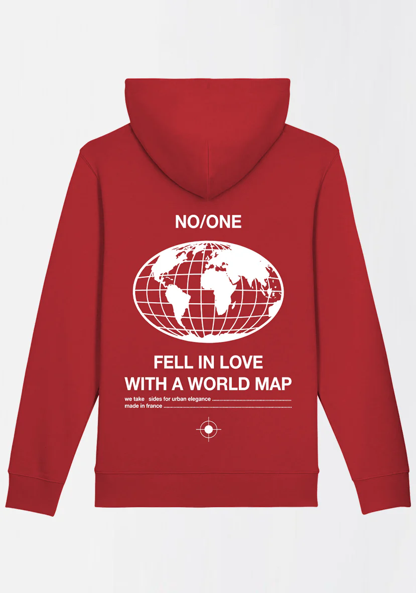 Sweat à capuche rouge unisexe en coton bio avec logo « WORLD MAP » imprimé dans le dos. l est fabriqué à partir de tissus respectueux de l’environnement pour un mode de vie durable, tandis que son design unique lui confère un style personnel audacieux.