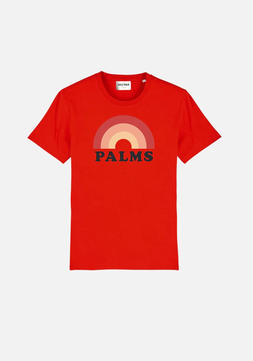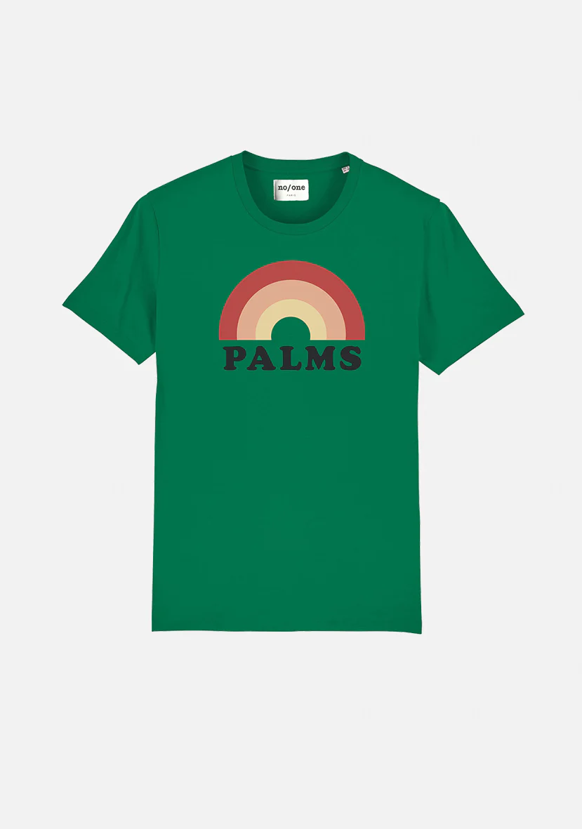 T-shirt unisexe manches courtes en coton bio avec imprimé « PALMS » sur la poitrine. Ce motif arc-en-ciel revisité est un clin d’œil aux divers quartiers de Los Angeles, offrant un t-shirt léger et intemporel.