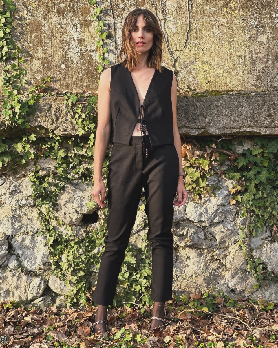 Un intemporel qui se porte à toutes les saisons Veste unie noire sans manche Encolure en V profonde qui se ferme par un laçage décoré de perles Composition: 100% polyester