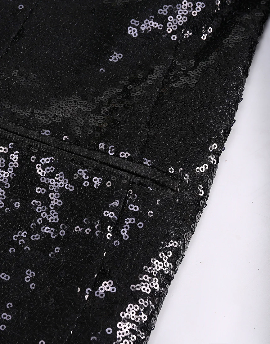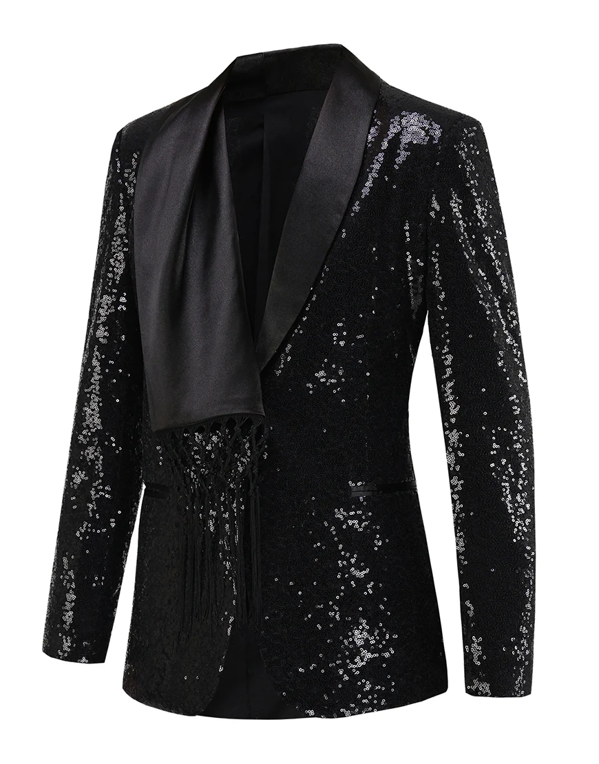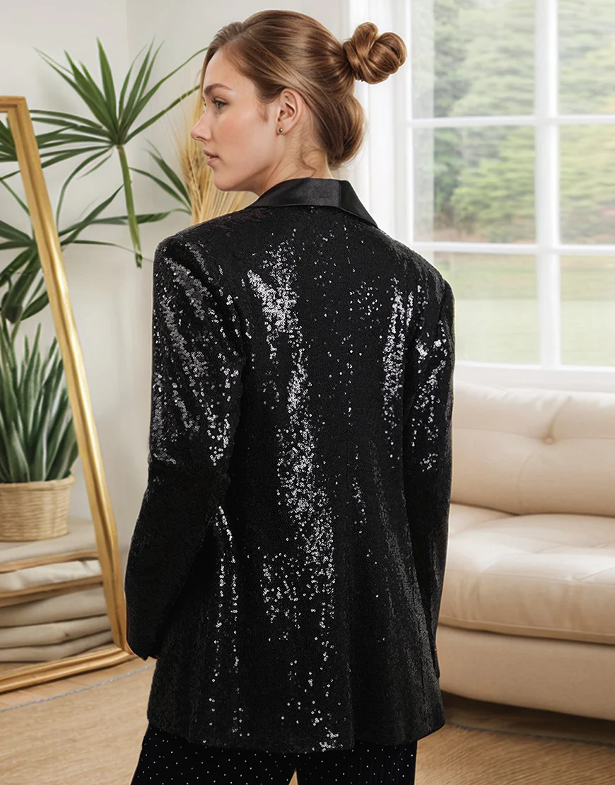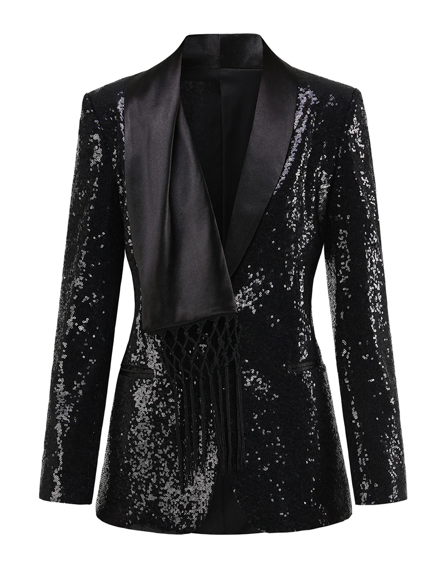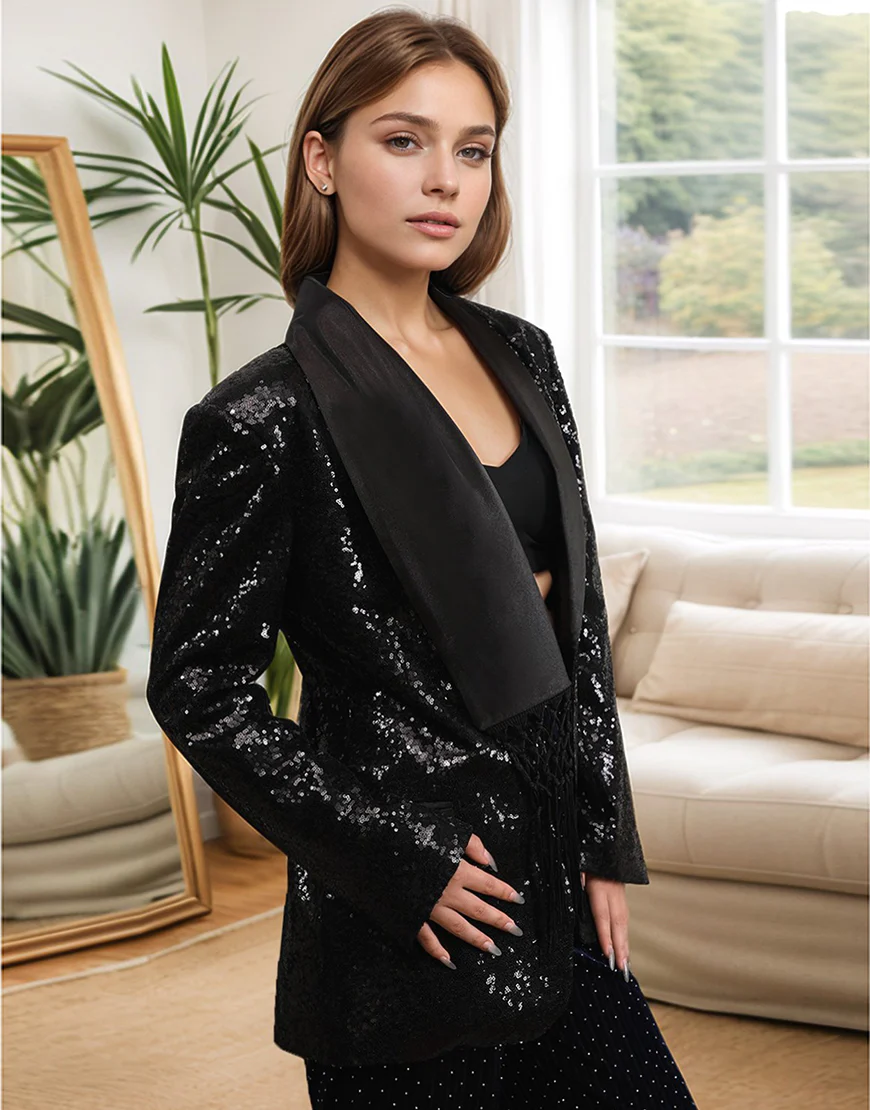 Confectionnée avec des paillettes et des franges, cette veste femme avec revers en losanges noirs apportera une touche d’élégance à votre tenue. Son design unique et sophistiqué vous fera briller lors de vos soirées. Ajoutez-la à votre garde-robe pour une allure glamour et tendance.