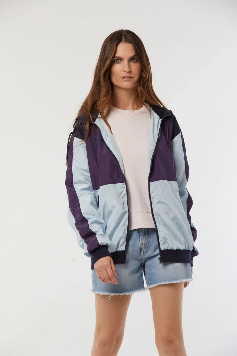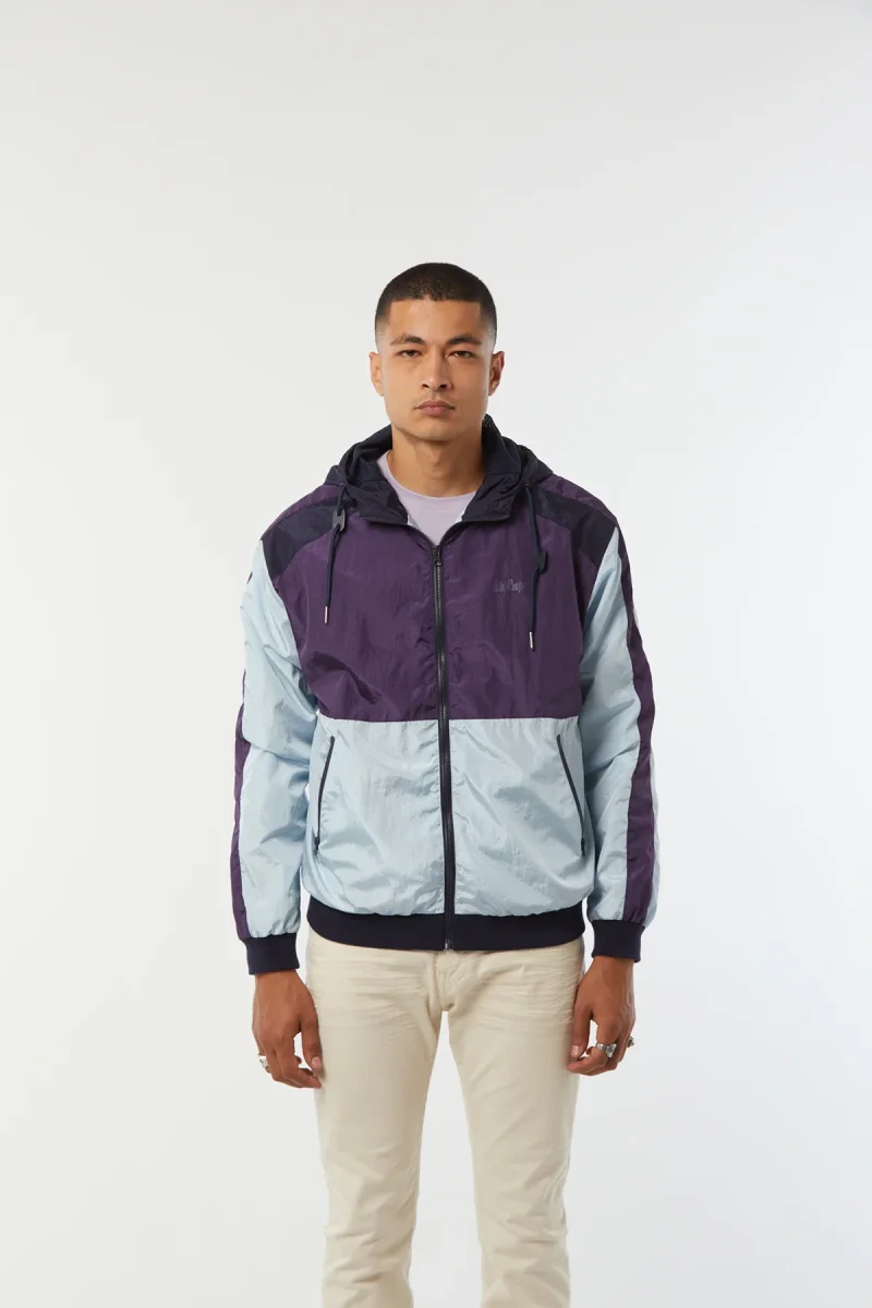 Veste manches longues, esprit « coupe vent » mixte à découpes colorées / broderie poitrine, fermeture devant zippée Le mannequin mesure 1.85 cm et porte la taille M