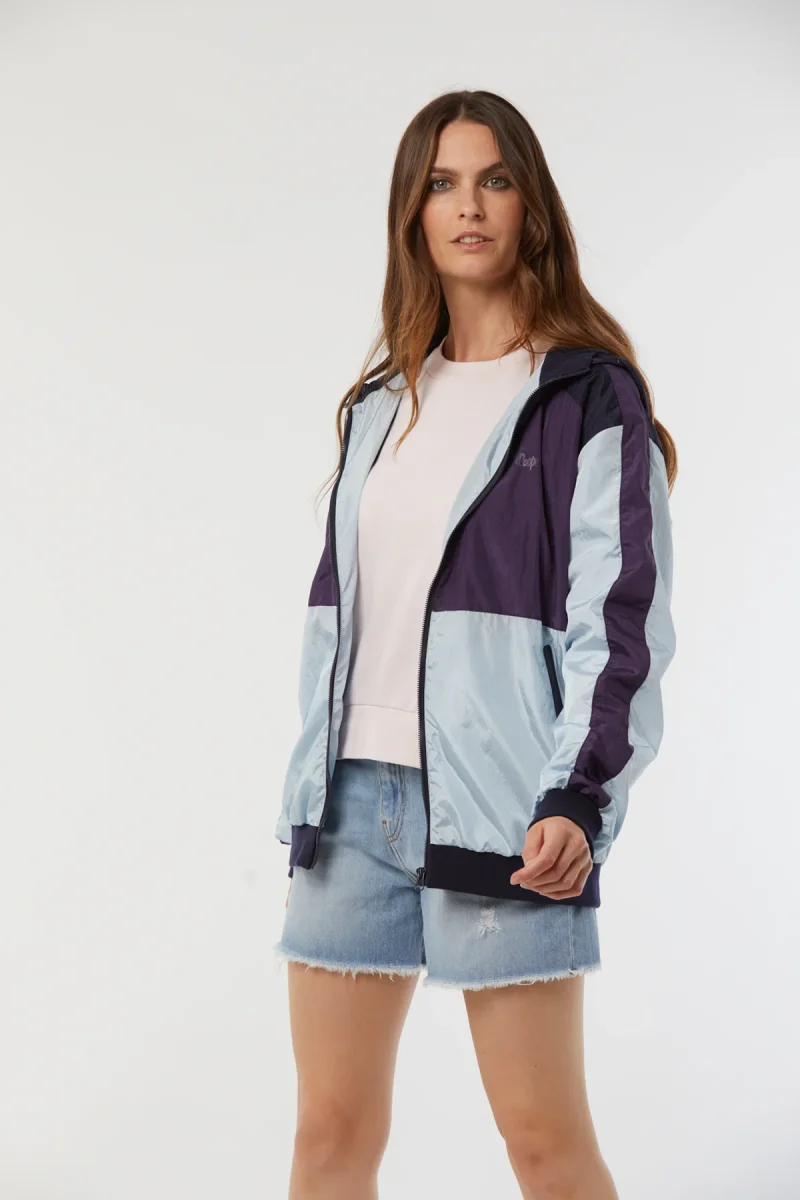 Veste manches longues, esprit « coupe vent » mixte à découpes colorées / broderie poitrine, fermeture devant zippée