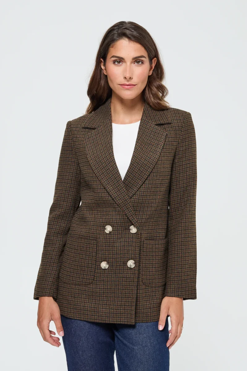 Blazer femme croisé au motif chevron confectionné dans un mélange chaud et structuré de laine et polyester, il offre un tombé impeccable tout en garantissant confort et chaleur lors des journées plus fraîches.