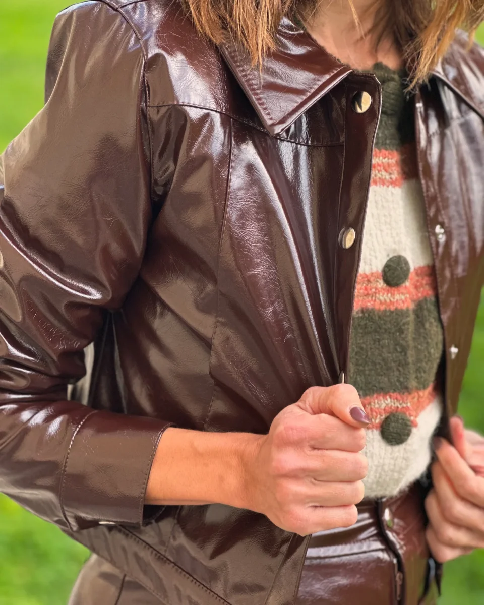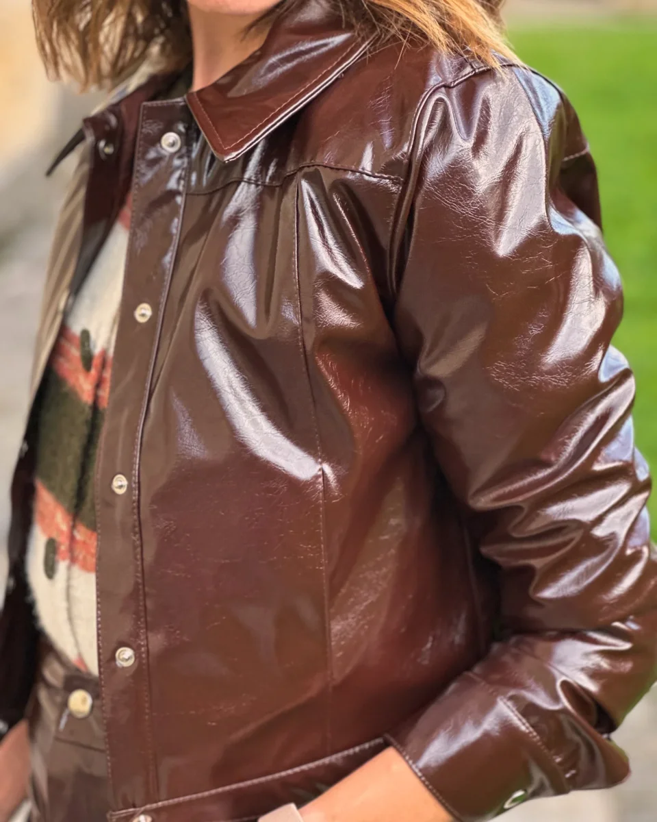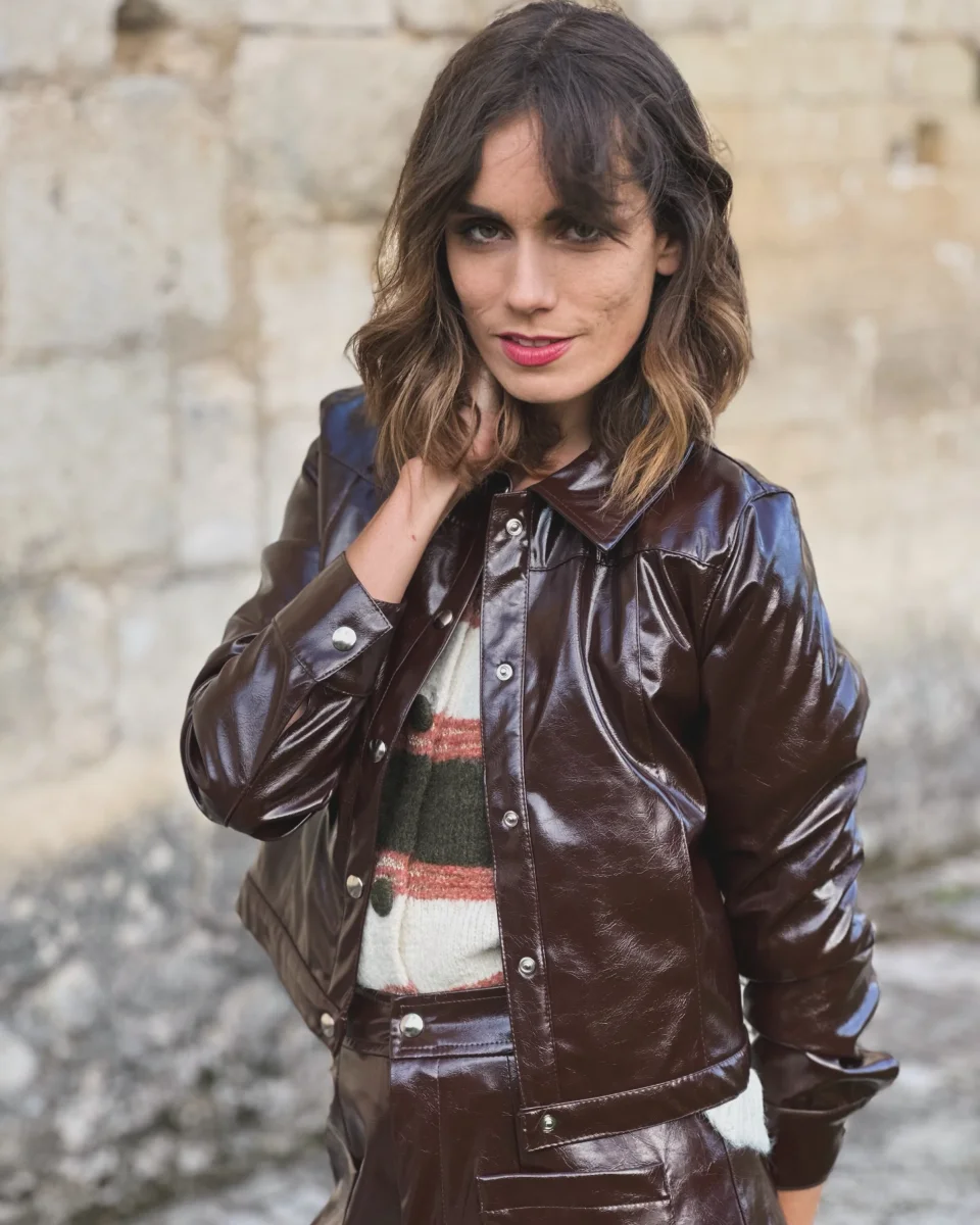 Veste vinyle courte pour un look sixties Col chemise Manche longue Fermeture par pression sur le devant Fabrication française 65% Polyester, 35% Polyurethane