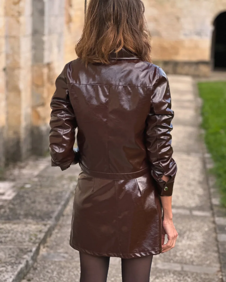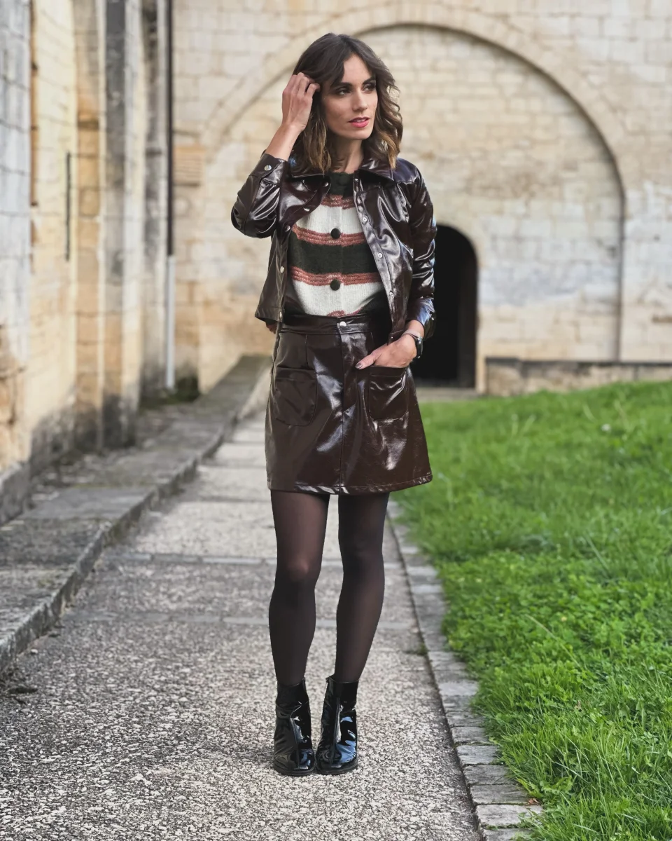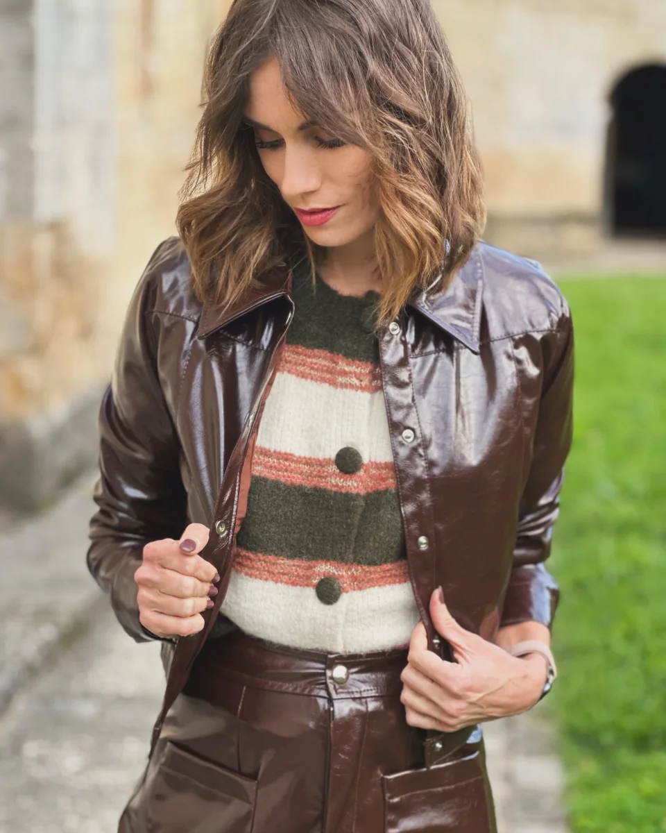 Veste vinyle courte pour un look sixties Col chemise Manche longue Fermeture par pression sur le devant Fabrication française 65% Polyester, 35% Polyurethane